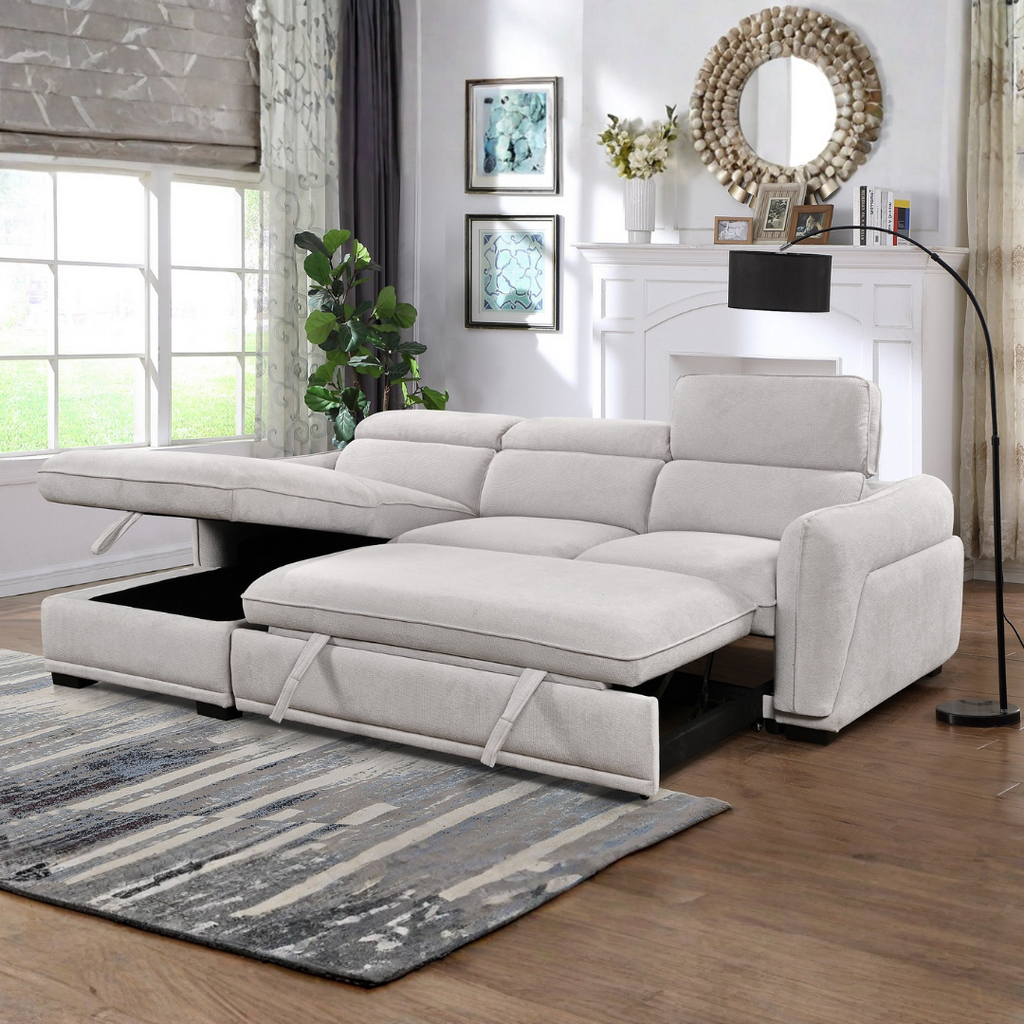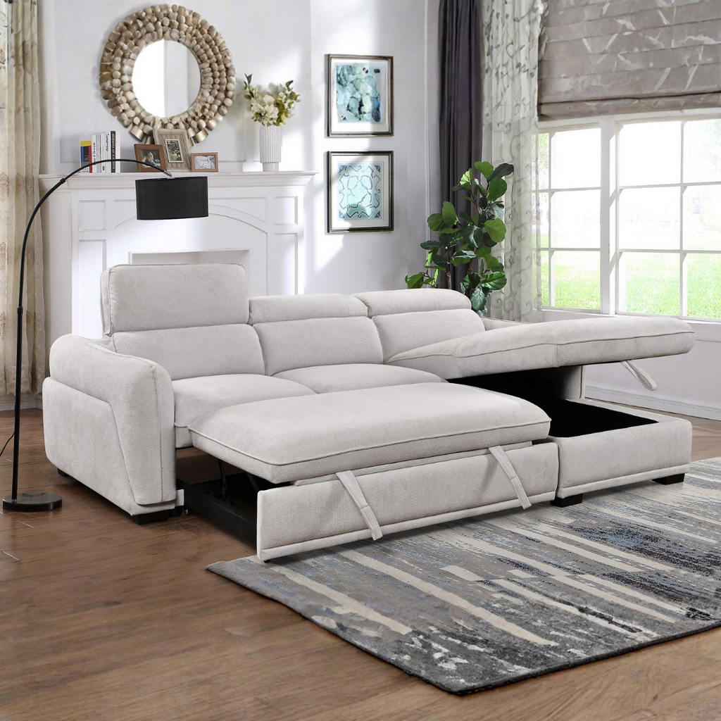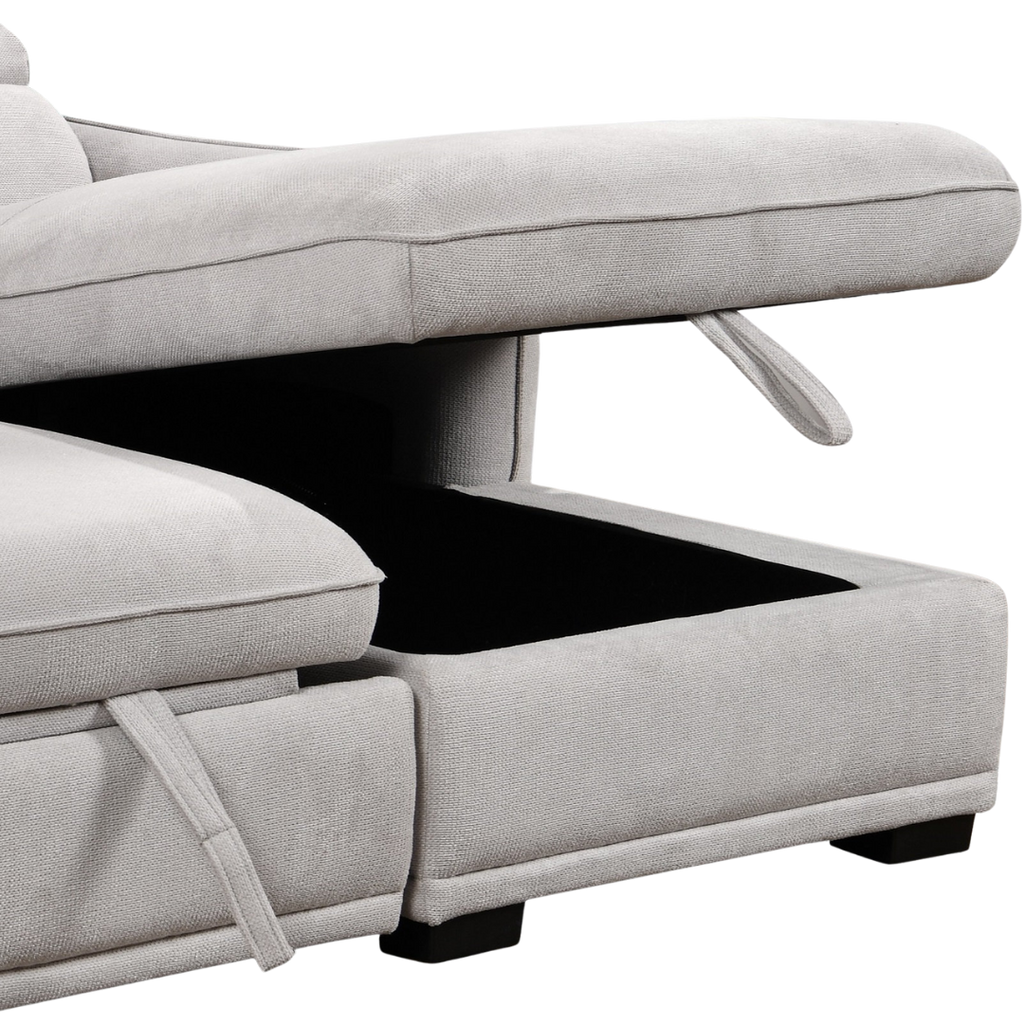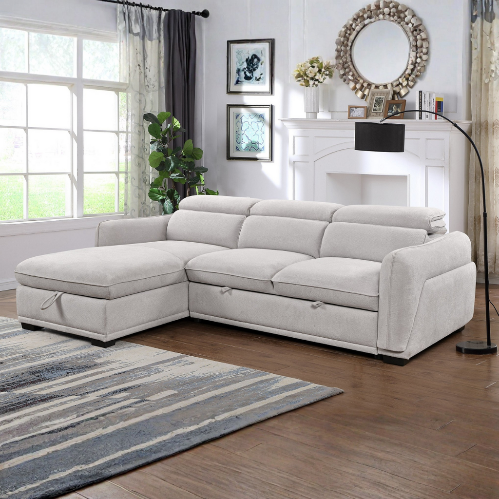 A modern light-grey sofa bed sectional with adjustable headrests, a smooth pull-out sleeper, and a large lift-up storage chaise. Available in left- or right-hand facing configurations to fit any living space.
