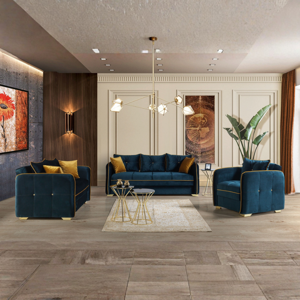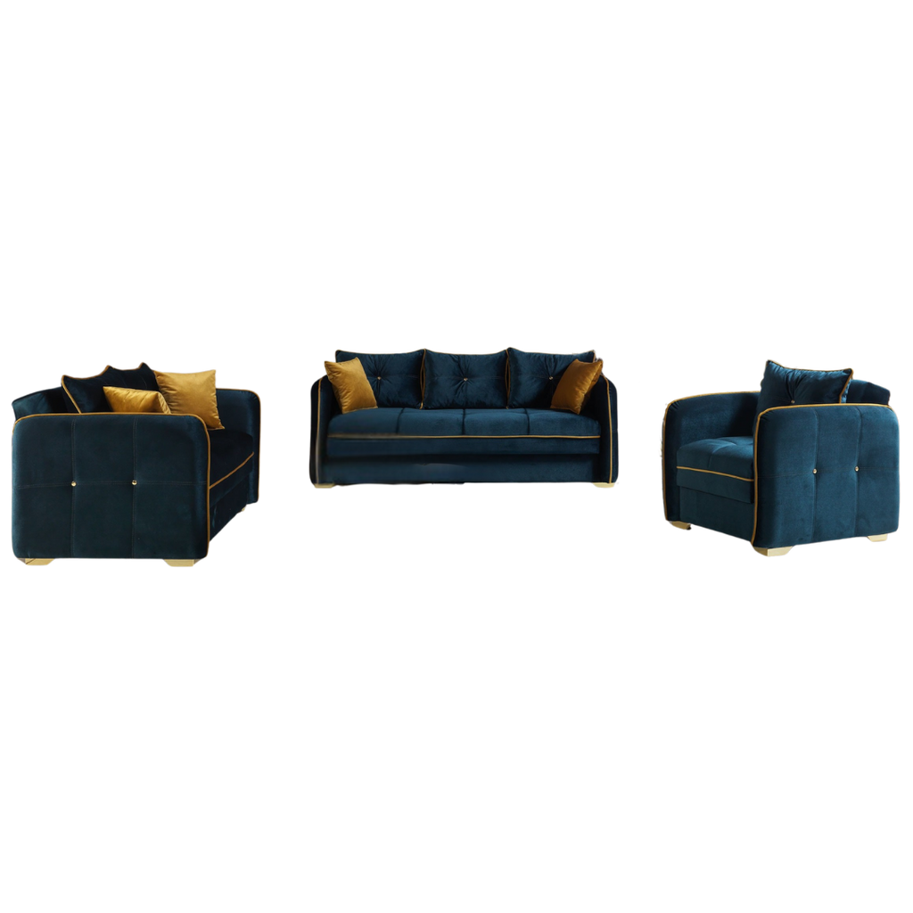 The Milan Blue Collection brings a striking blend of elegance and comfort to your living room. Its rich velvet fabric creates a luxurious texture, while the sophisticated gold trim introduces a high-end visual contrast. With deep cushions and sculpted armrests, each piece ensures an exceptional seating experience. Bold, modern, and timeless, this set enhances any interior with a perfect balance of chic design and premium comfort.