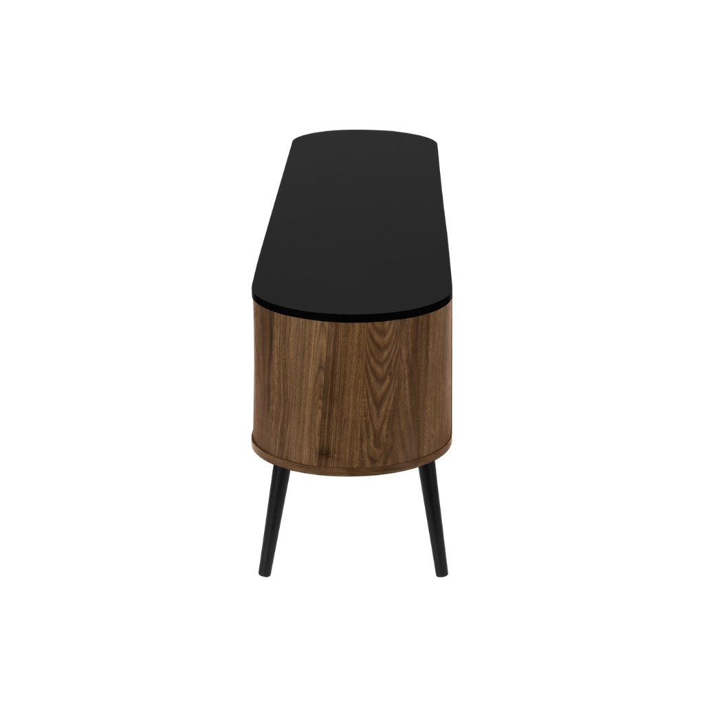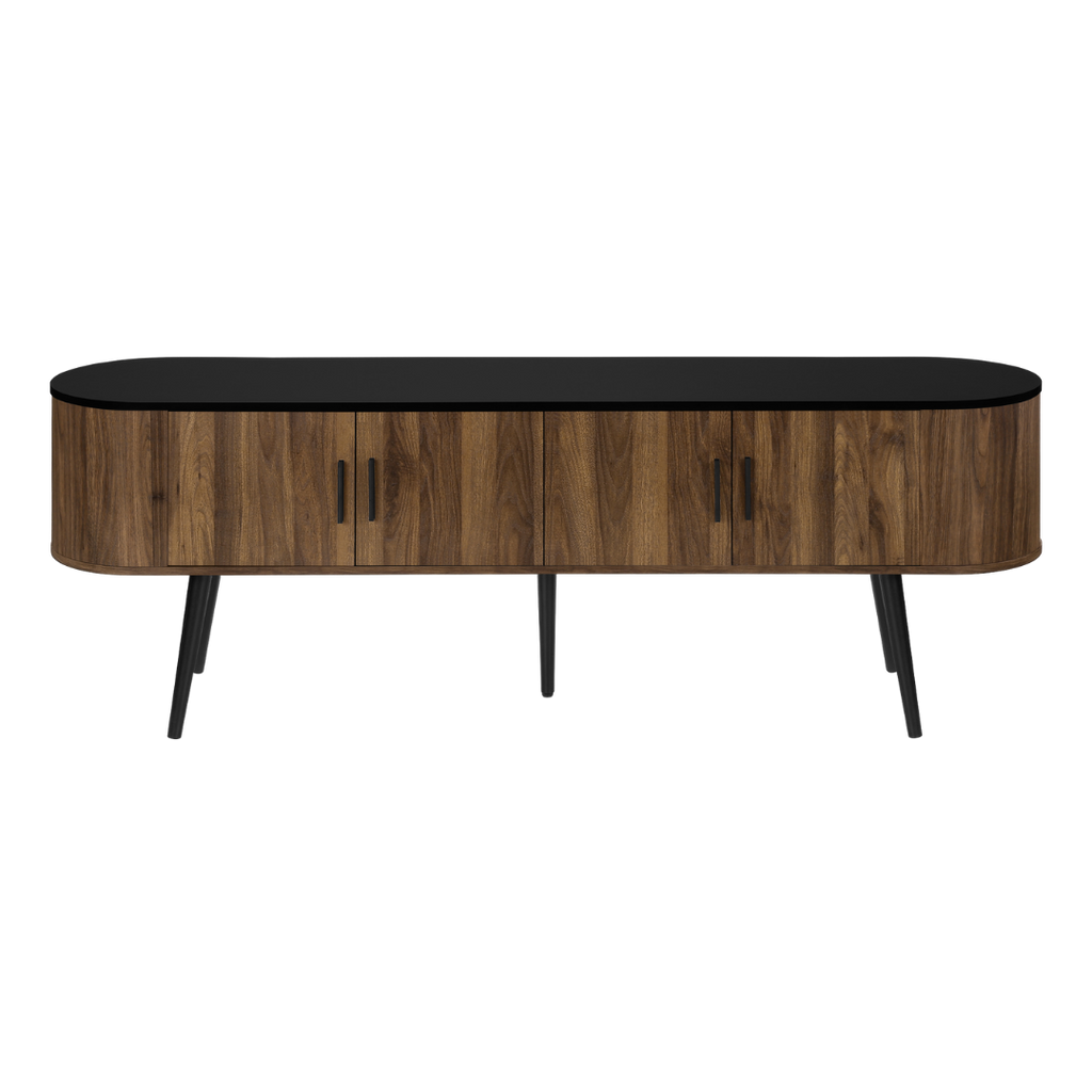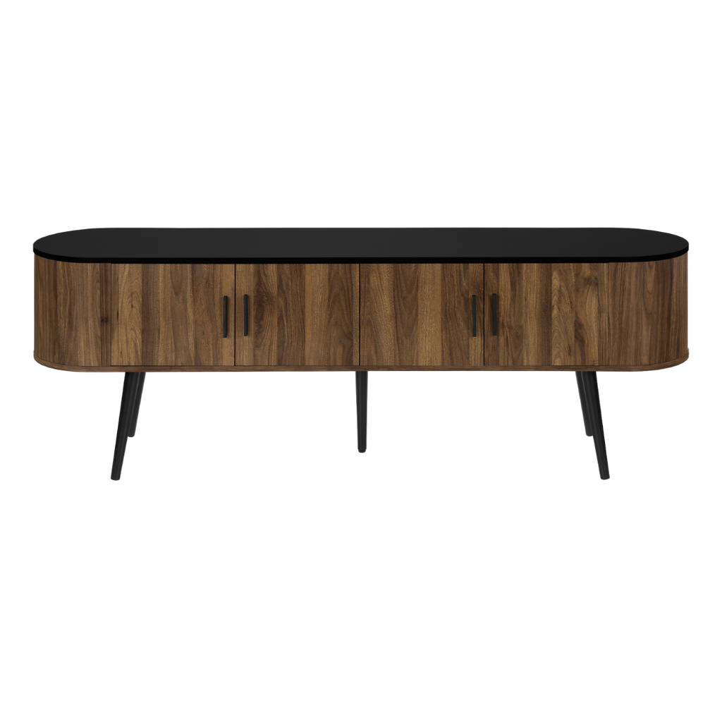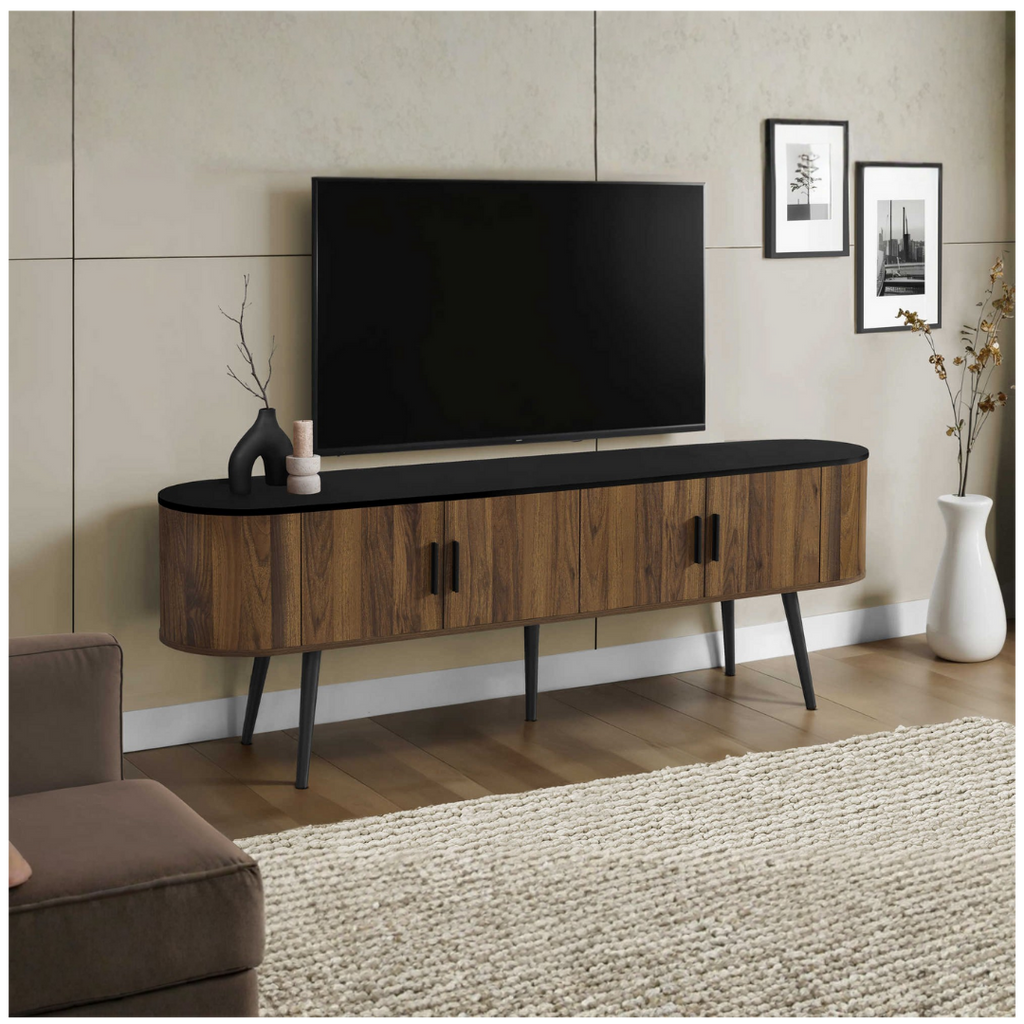 The Narel TV stand blends contemporary lines with mid-century curves, creating a standout piece for modern living rooms. Its two-tone black and walnut design elevates any décor, while the four closed storage compartments keep media essentials neatly hidden. Two concealed cable-management openings maintain a clean setup, and the wide top surface accommodates large screens with ease. Built with solid wood legs and a smooth laminate finish, Narel delivers long-lasting stability with a stylish minimalist presence.