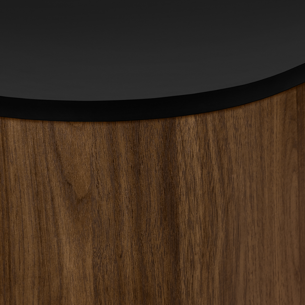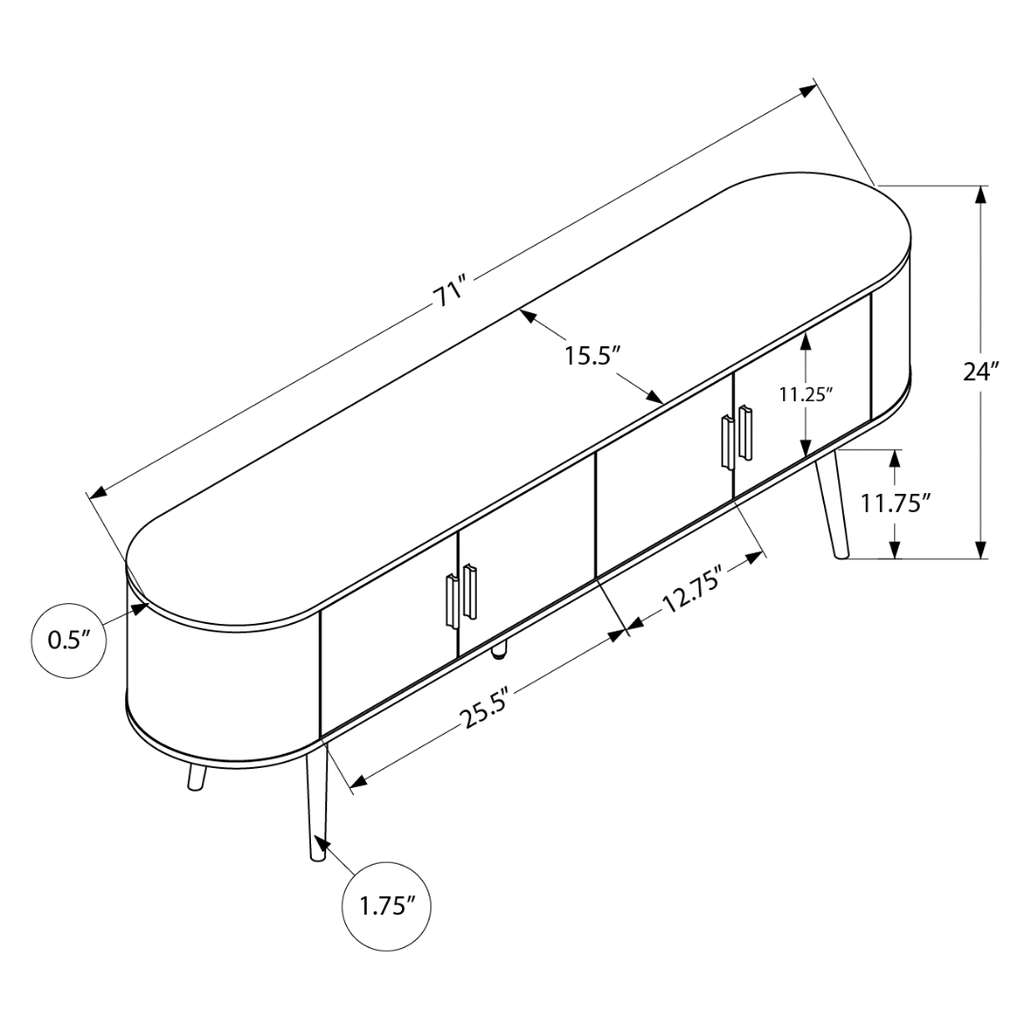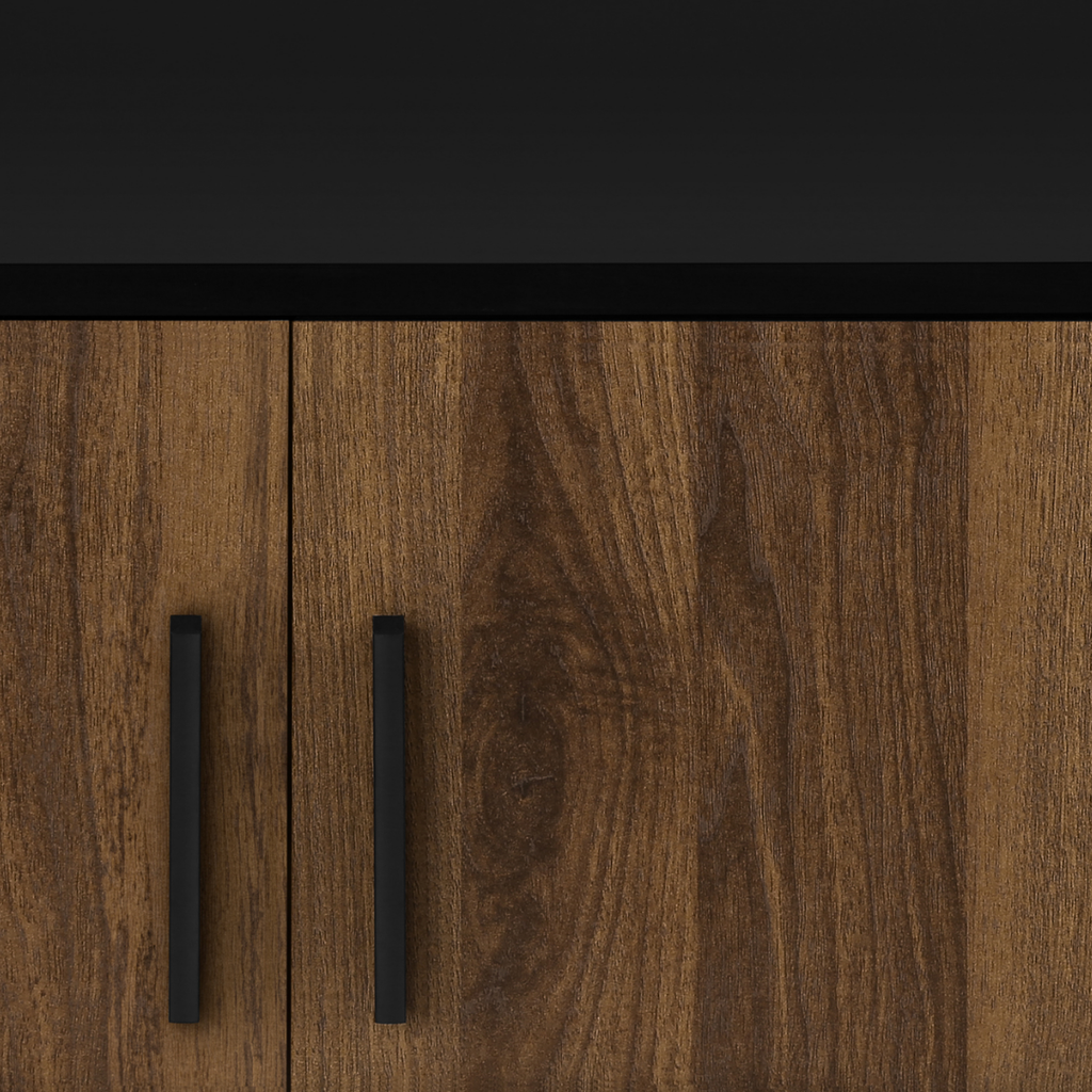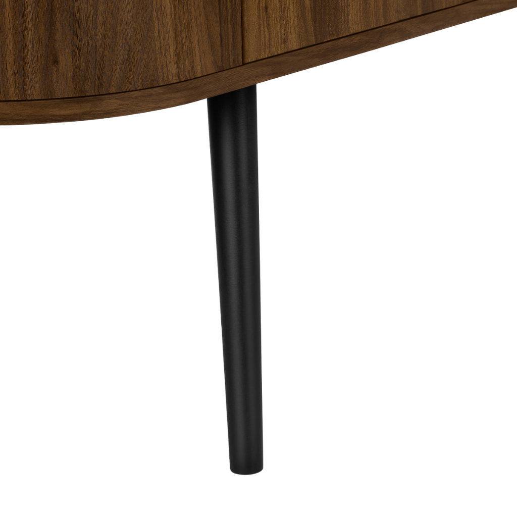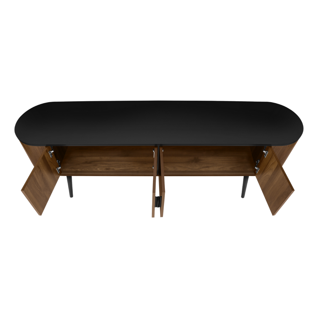 The Narel TV stand blends contemporary lines with mid-century curves, creating a standout piece for modern living rooms. Its two-tone black and walnut design elevates any décor, while the four closed storage compartments keep media essentials neatly hidden. Two concealed cable-management openings maintain a clean setup, and the wide top surface accommodates large screens with ease. Built with solid wood legs and a smooth laminate finish, Narel delivers long-lasting stability with a stylish minimalist presence.