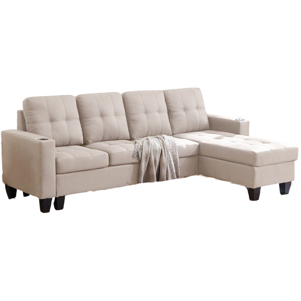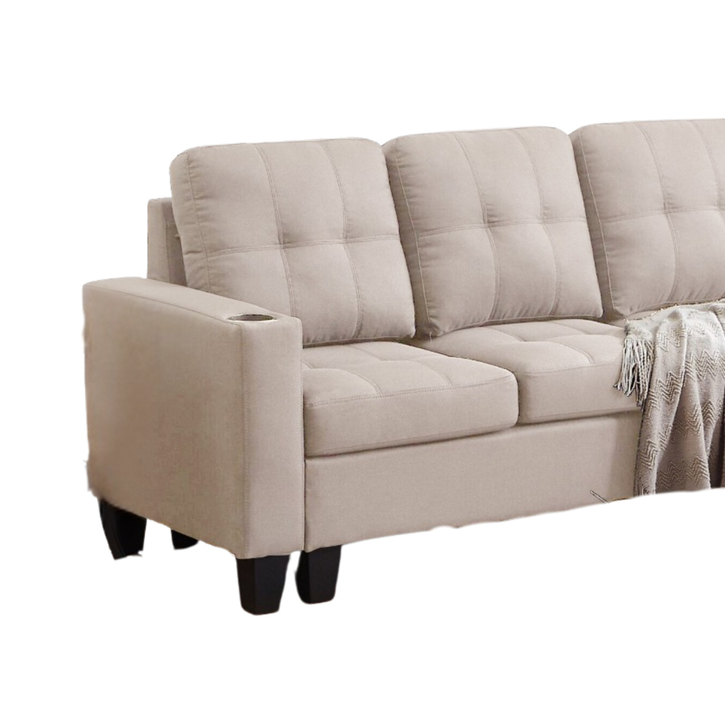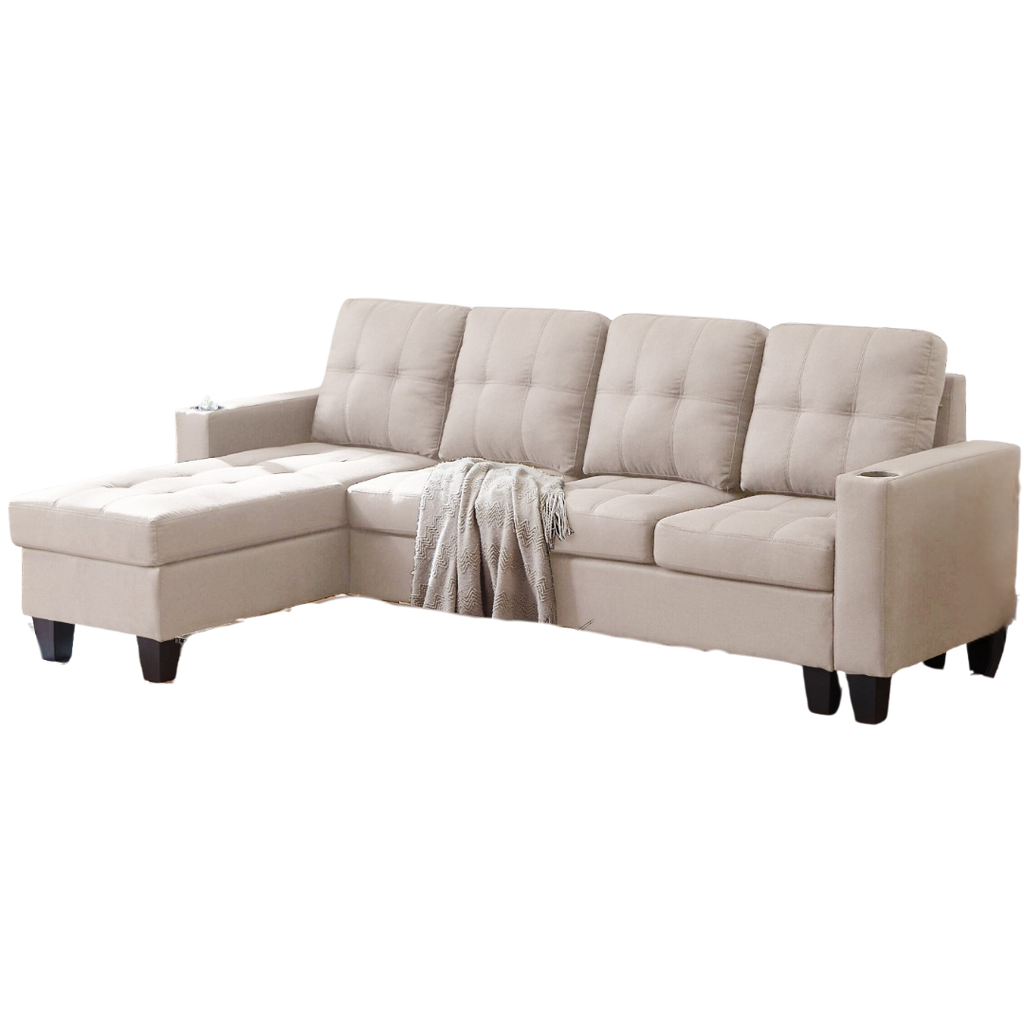 The beige Naro sectional brings a soft, welcoming feel to any living room. Its reversible chaise makes it easy to adapt your space, while its tufted design and comfortable seating make it ideal for long lounging sessions. The built-in cupholders add a functional touch to enhance the everyday experience.