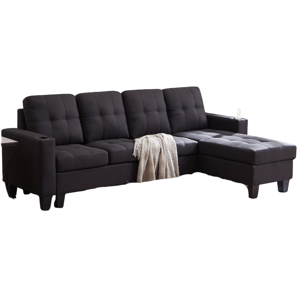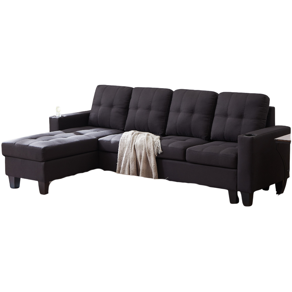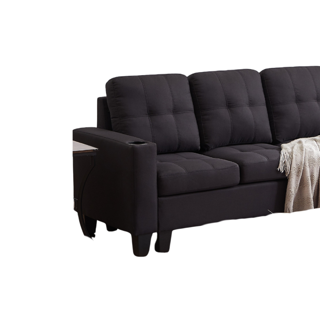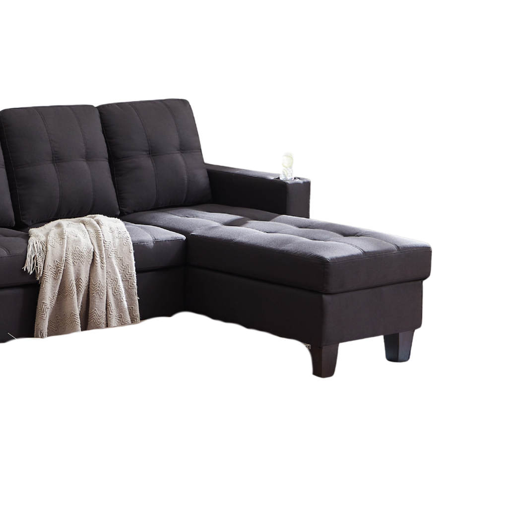 The Naro in black fabric combines versatility, comfort and minimalist styling. Its reversible chaise provides complete layout flexibility, while the tufted cushions enhance both comfort and aesthetics. Designed with cupholders for added convenience, this model is ideal for everyday living.