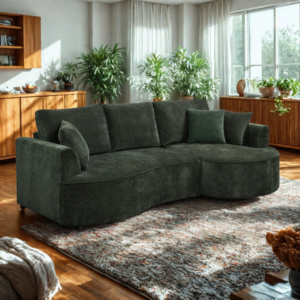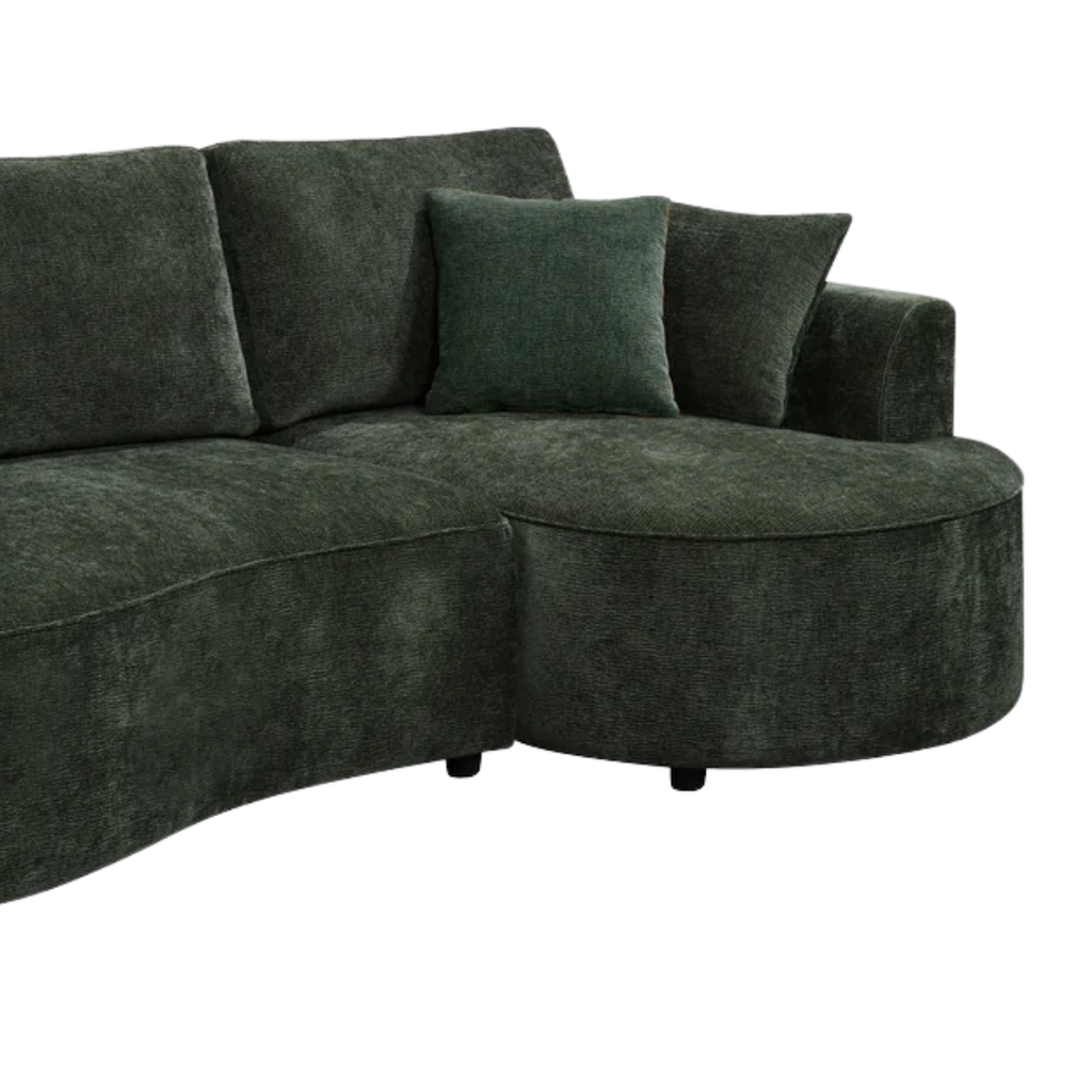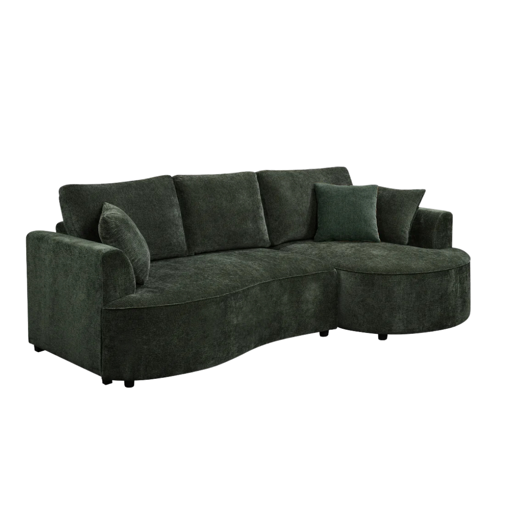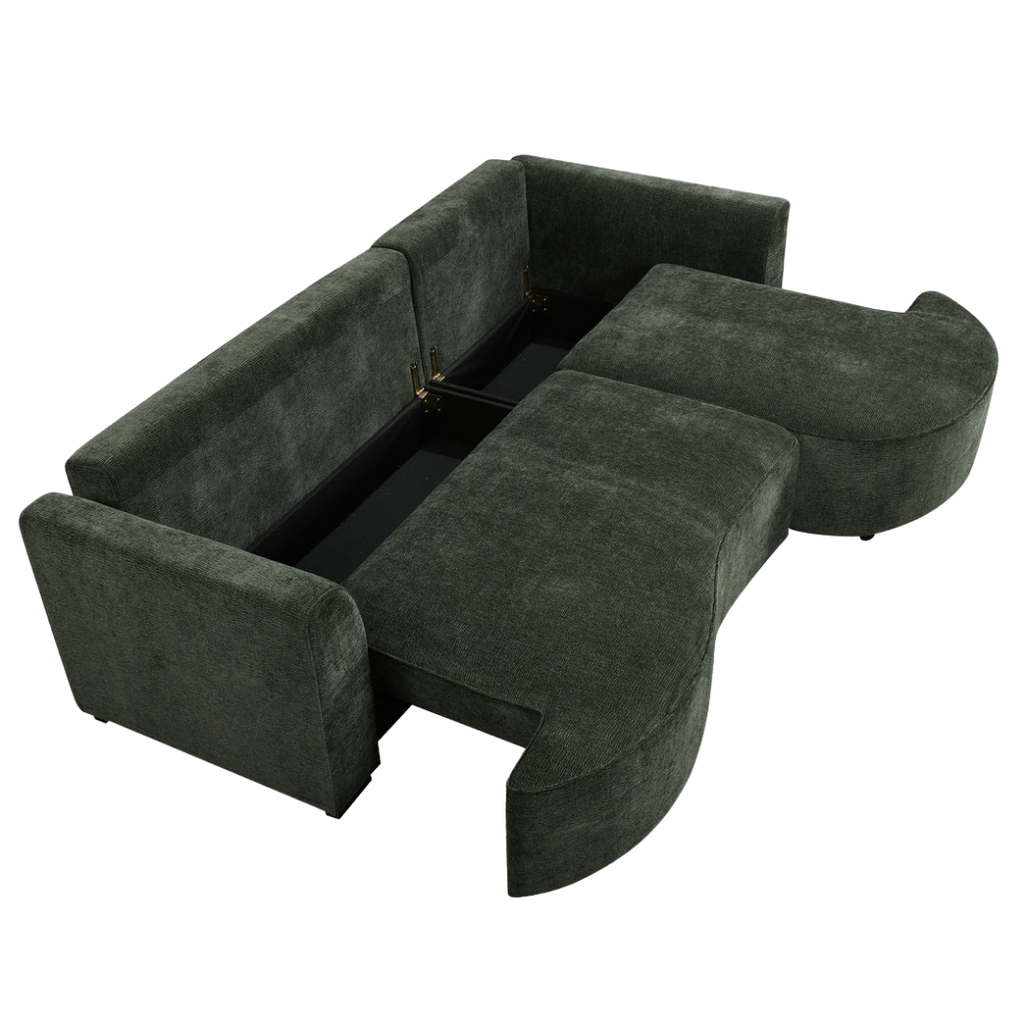 The Noliva sectional makes a statement with its sweeping curved silhouette and deep forest-green upholstery. Designed for both aesthetics and utility, it features a pull-out sleeper that converts the sofa into a comfortable guest bed, while the chaise opens to reveal hidden storage for blankets, pillows or essentials.