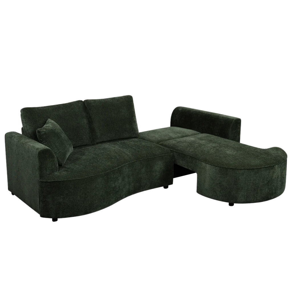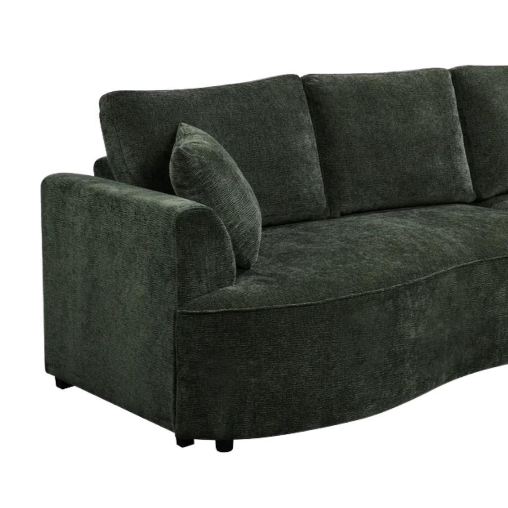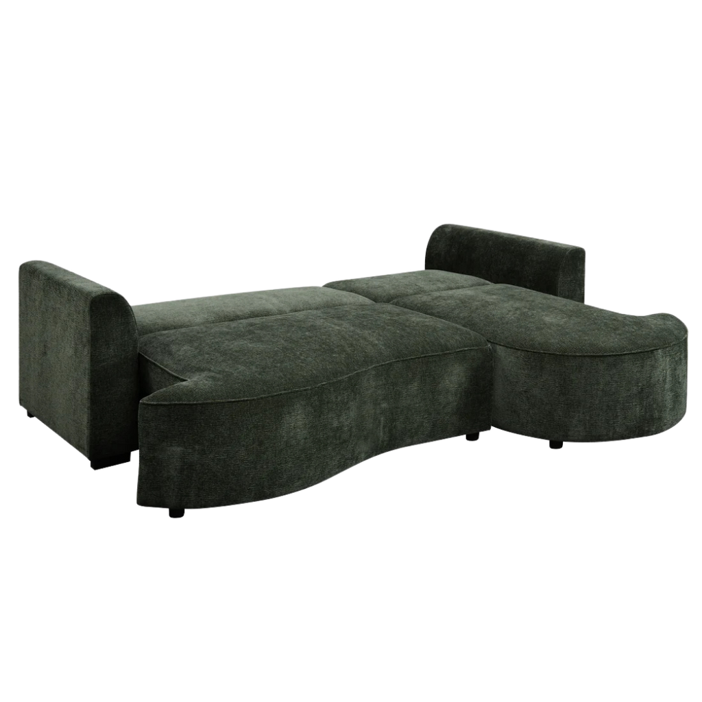 A curved sleeper sectional in deep forest green, combining sculptural design with hidden storage and a pull-out bed for practical everyday living.