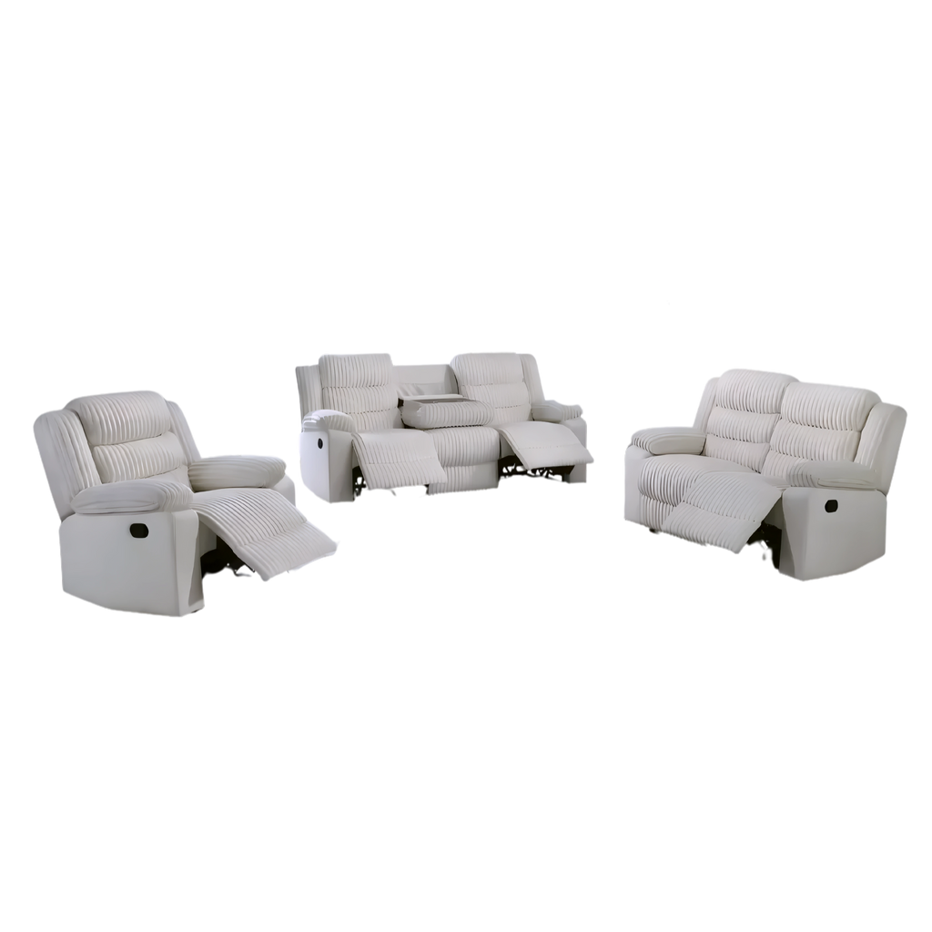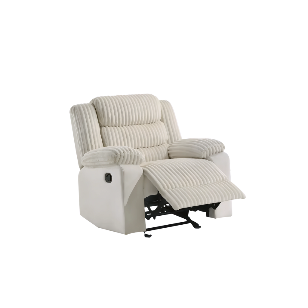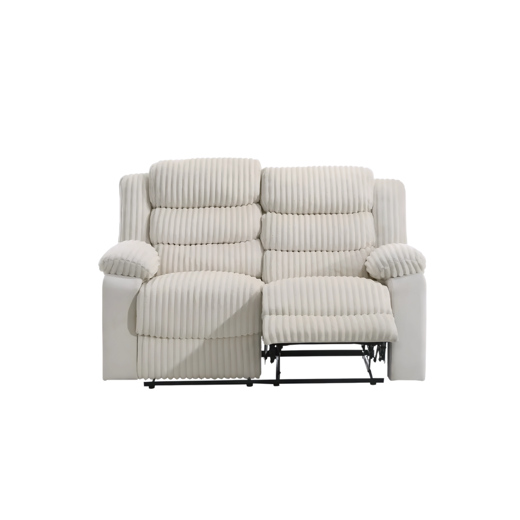 Plush brings a warm, inviting aesthetic with its velvet corduroy upholstery and generously padded seating. The manual reclining system provides smooth, effortless comfort across the sofa, loveseat, and recliner chair. Ideal for family living, the loveseat includes a drop-down tray with integrated cup holders—perfect for movie nights or casual lounging.