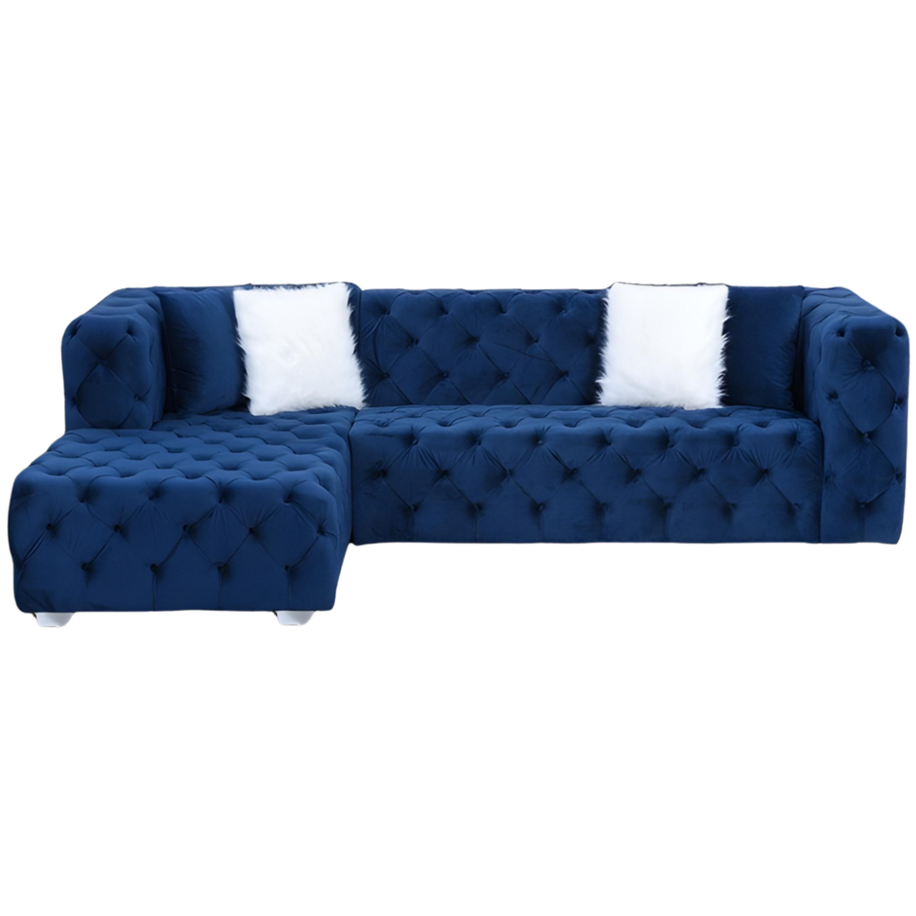 With its bold velvet finish and deep tufting, the Ravo sectional in blue brings a luxurious and modern feel to your home. The soft velvet fabric enhances comfort while adding a striking visual appeal.