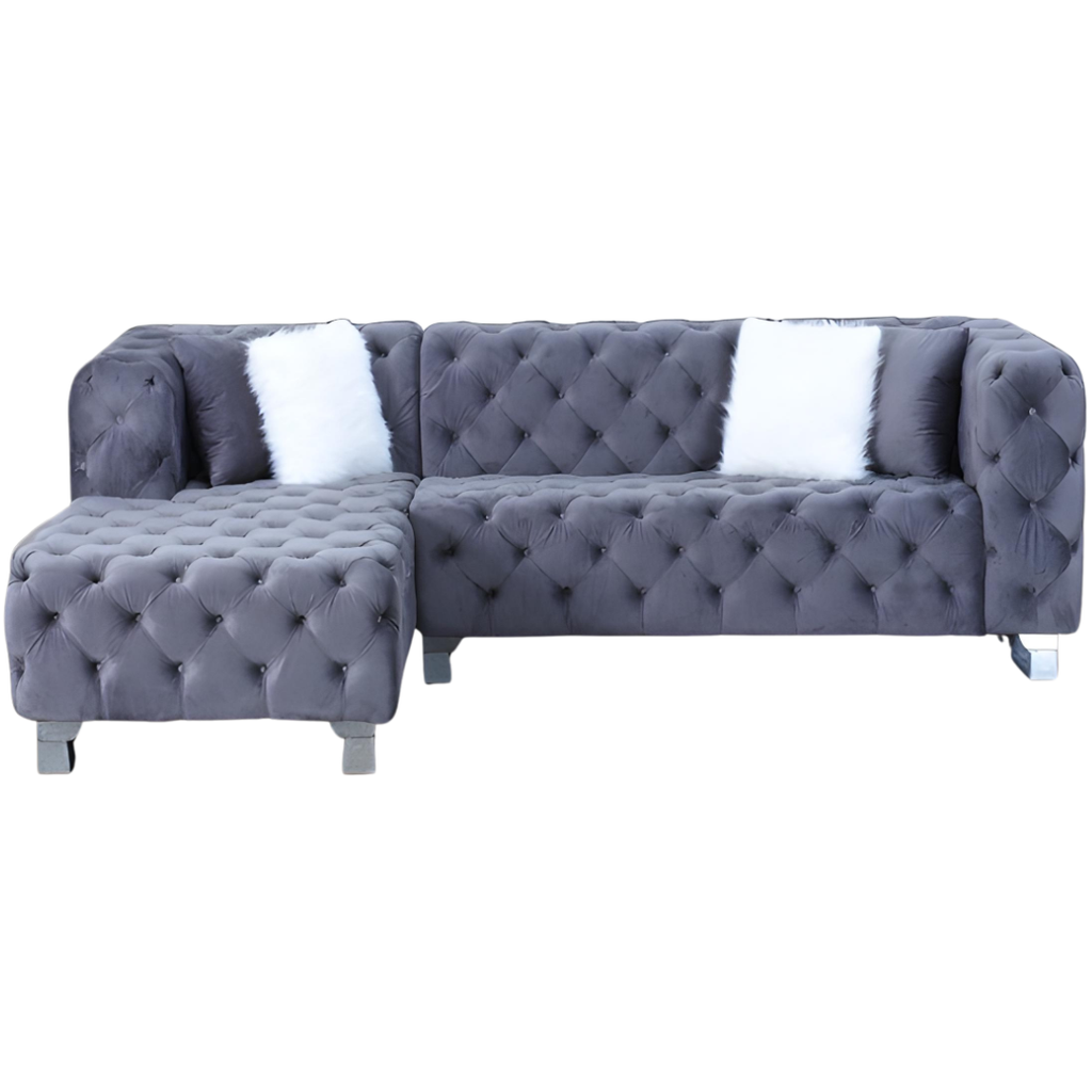 The Ravo sectional in grey velvet combines modern luxury with everyday functionality. Its deep tufting and smooth velvet upholstery create a refined yet comfortable seating experience.