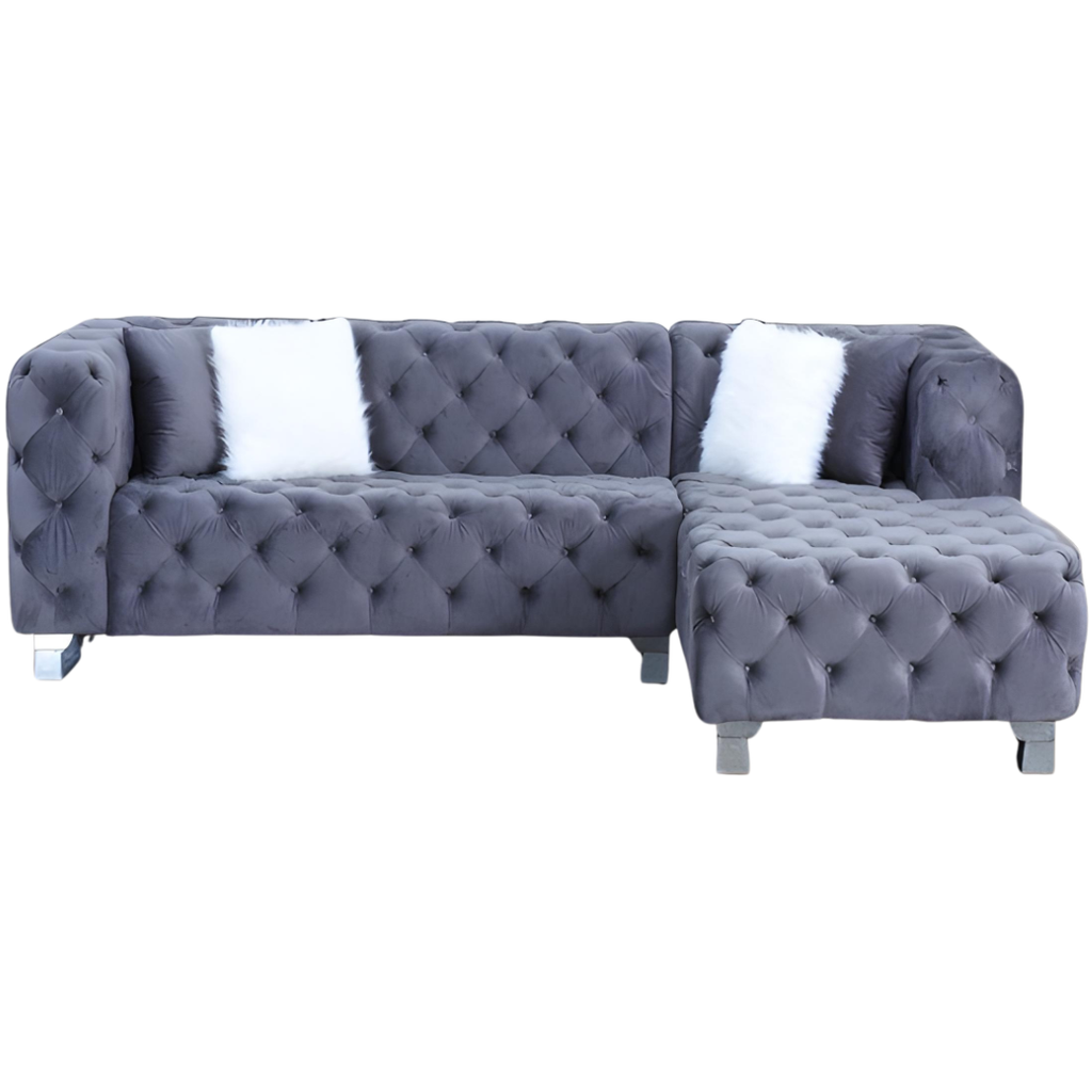 A modern tufted velvet sectional designed for comfort, style, and layout flexibility. Features a reversible chaise.