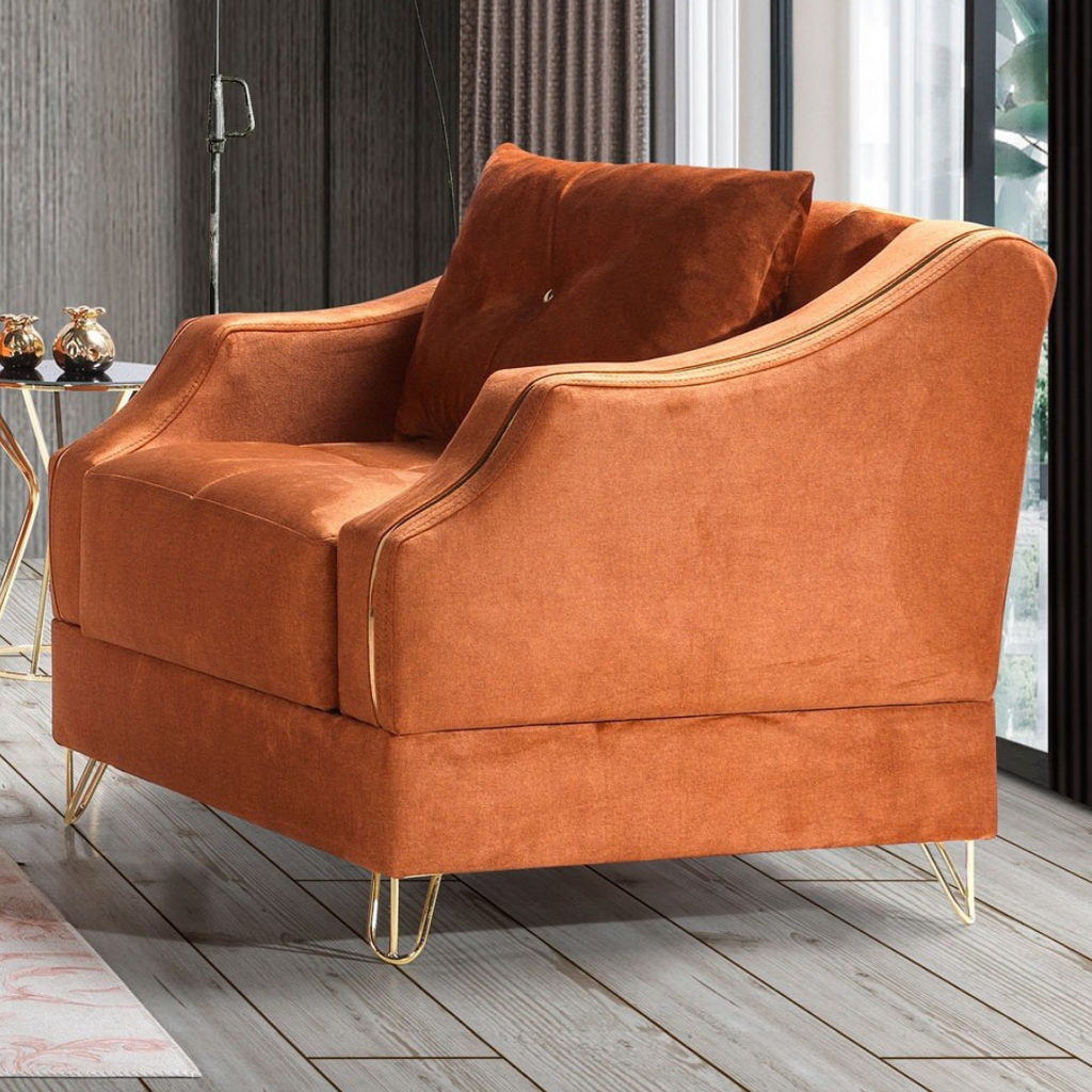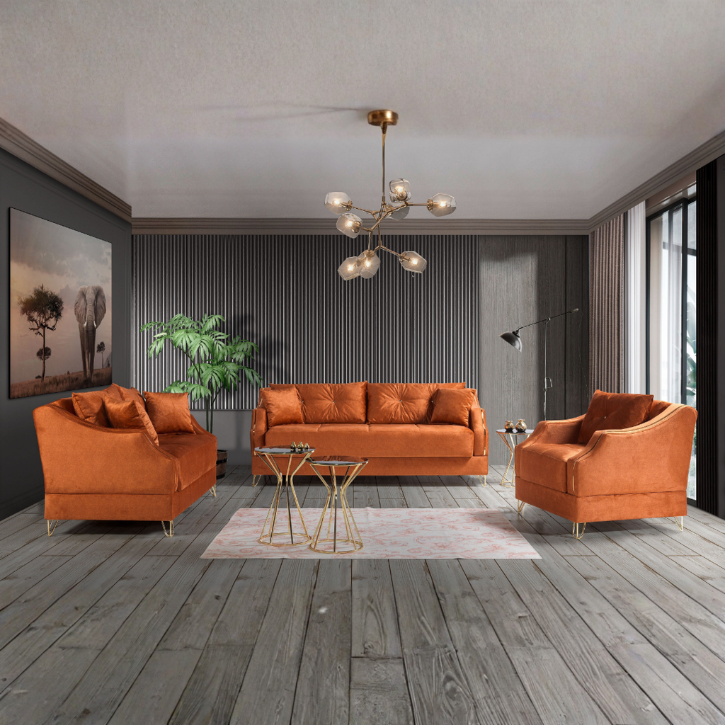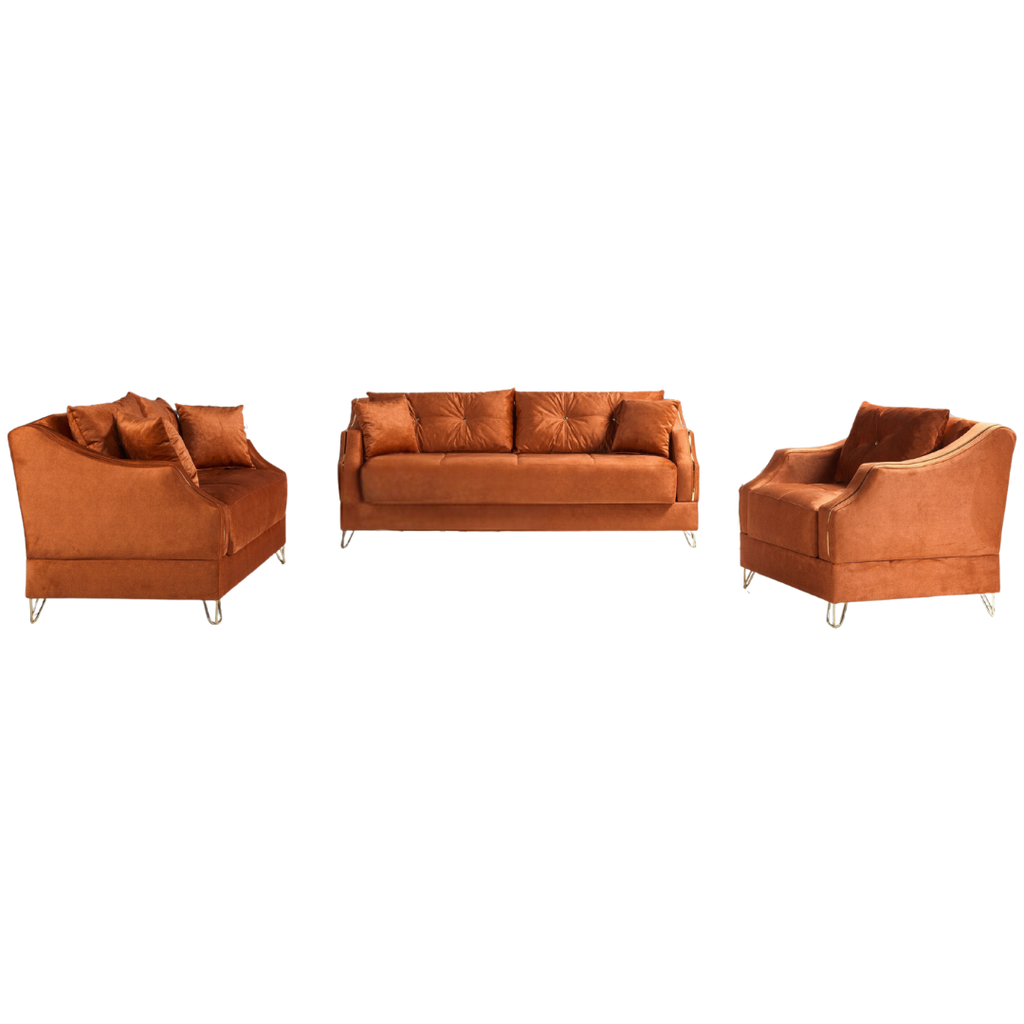 The Rydel Orange Collection delivers a striking blend of modern style and cozy comfort. Wrapped in rich velvet, the sofa, loveseat, and chair feature sculpted silhouettes that elevate your living room’s aesthetic. The warm orange tone creates a vibrant yet refined ambiance, while the plush cushions ensure exceptional comfort for everyday lounging. Gold-finished legs add a high-end touch, making this set an eye-catching centrepiece for contemporary interiors.