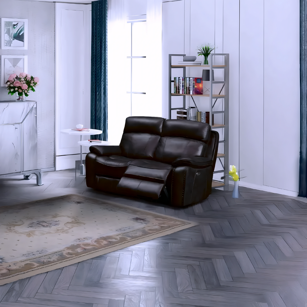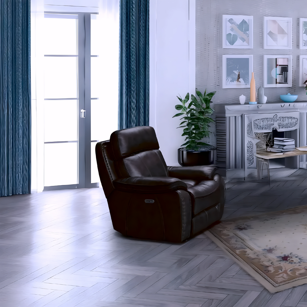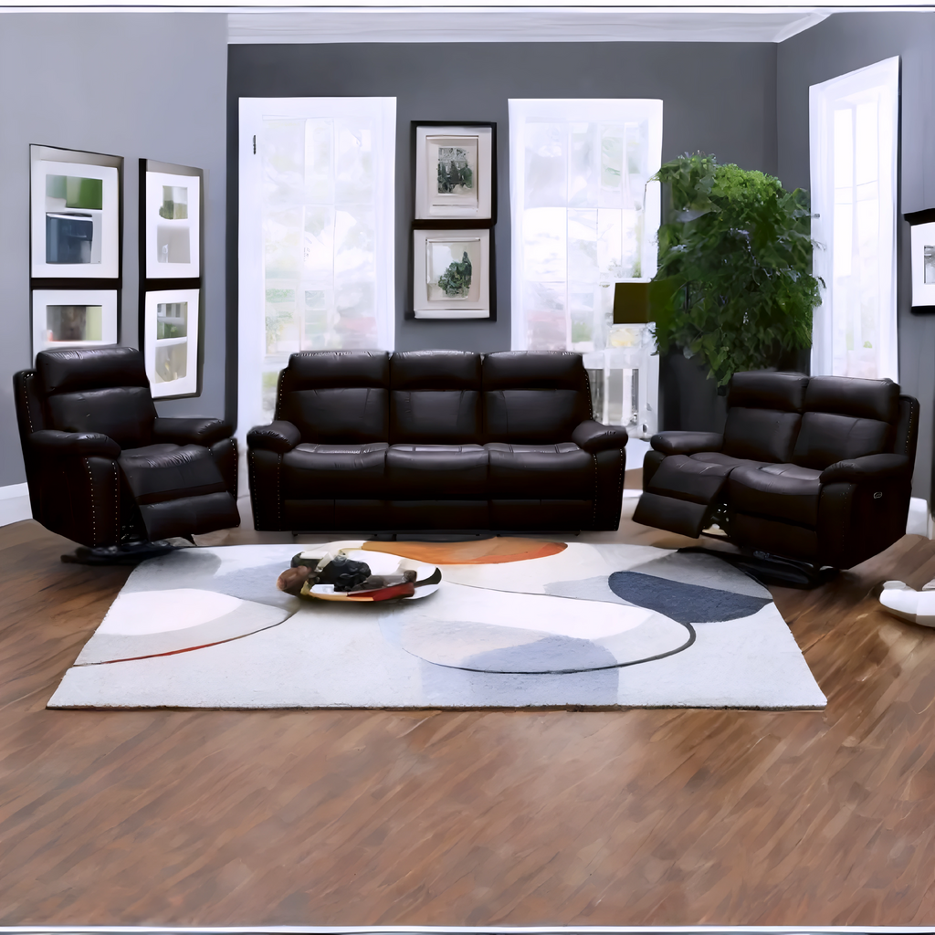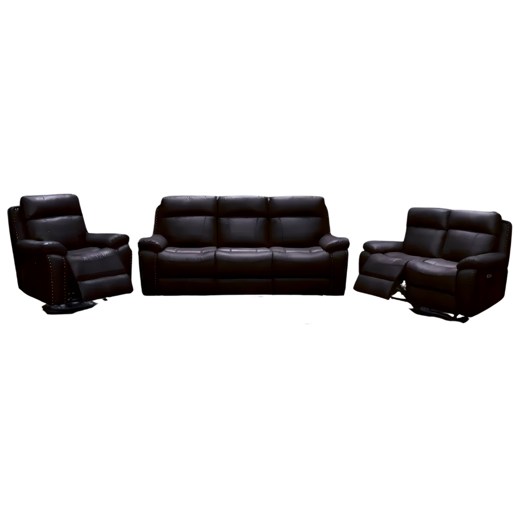 A luxurious chocolate-toned leather-gel power recliner set combining modern comfort, premium materials, and smooth reclining functionality for a fully immersive lounging experience.