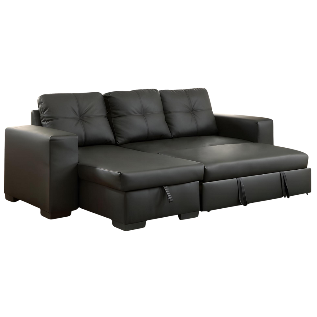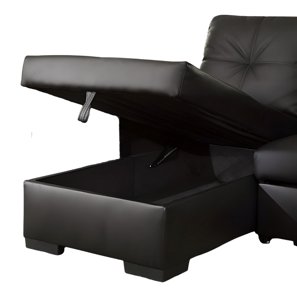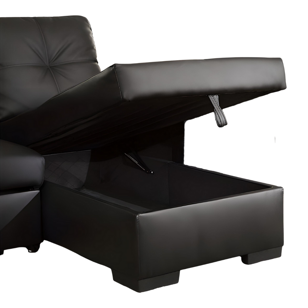 A compact and versatile faux-leather sofa bed sectional featuring a large storage chaise and a fully reversible configuration. Designed for small spaces, condos, and multipurpose living areas.