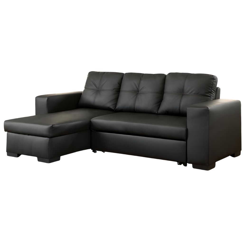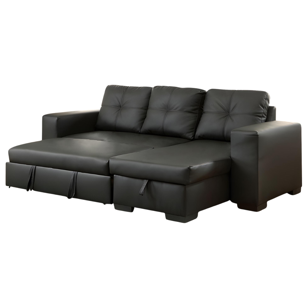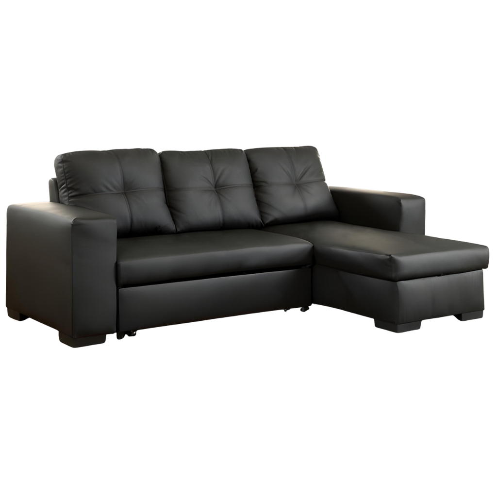 A compact and versatile faux-leather sofa bed sectional featuring a large storage chaise and a fully reversible configuration. Designed for small spaces, condos, and multipurpose living areas.