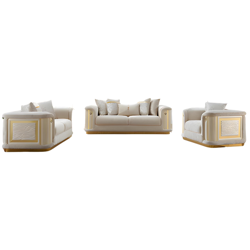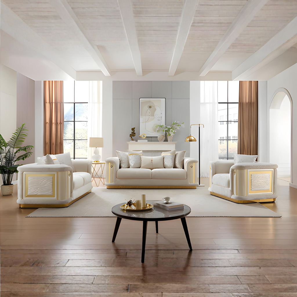 A refined, modern 3-piece living room set featuring plush seating, matte-finished wood accents, and elegant gold detailing designed to elevate any contemporary home.
