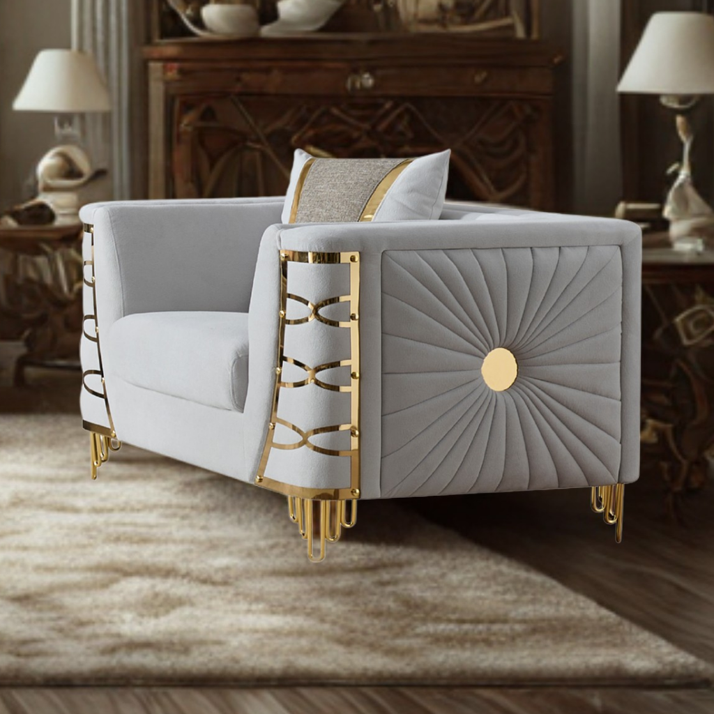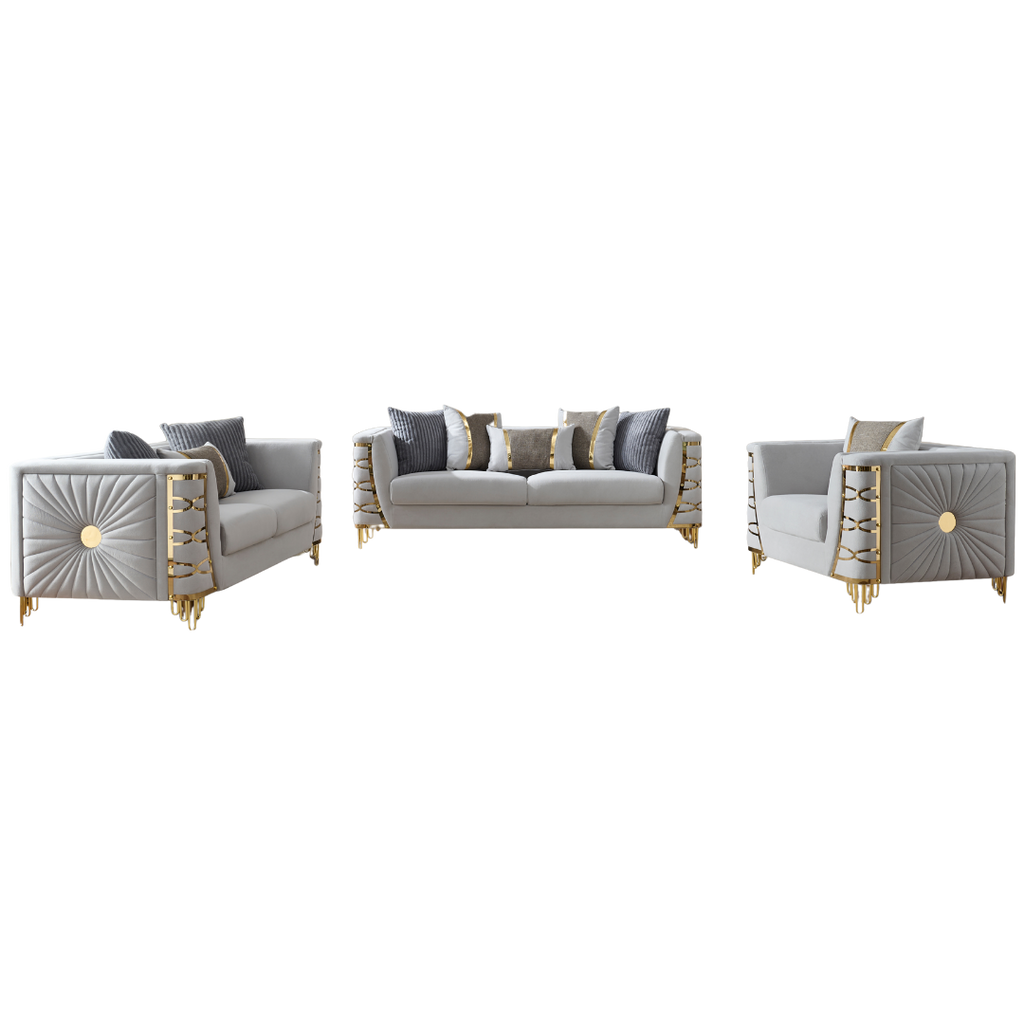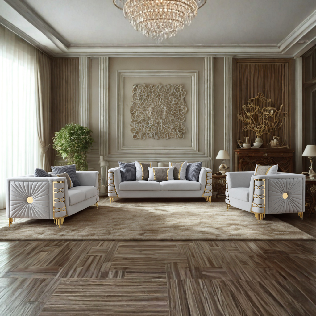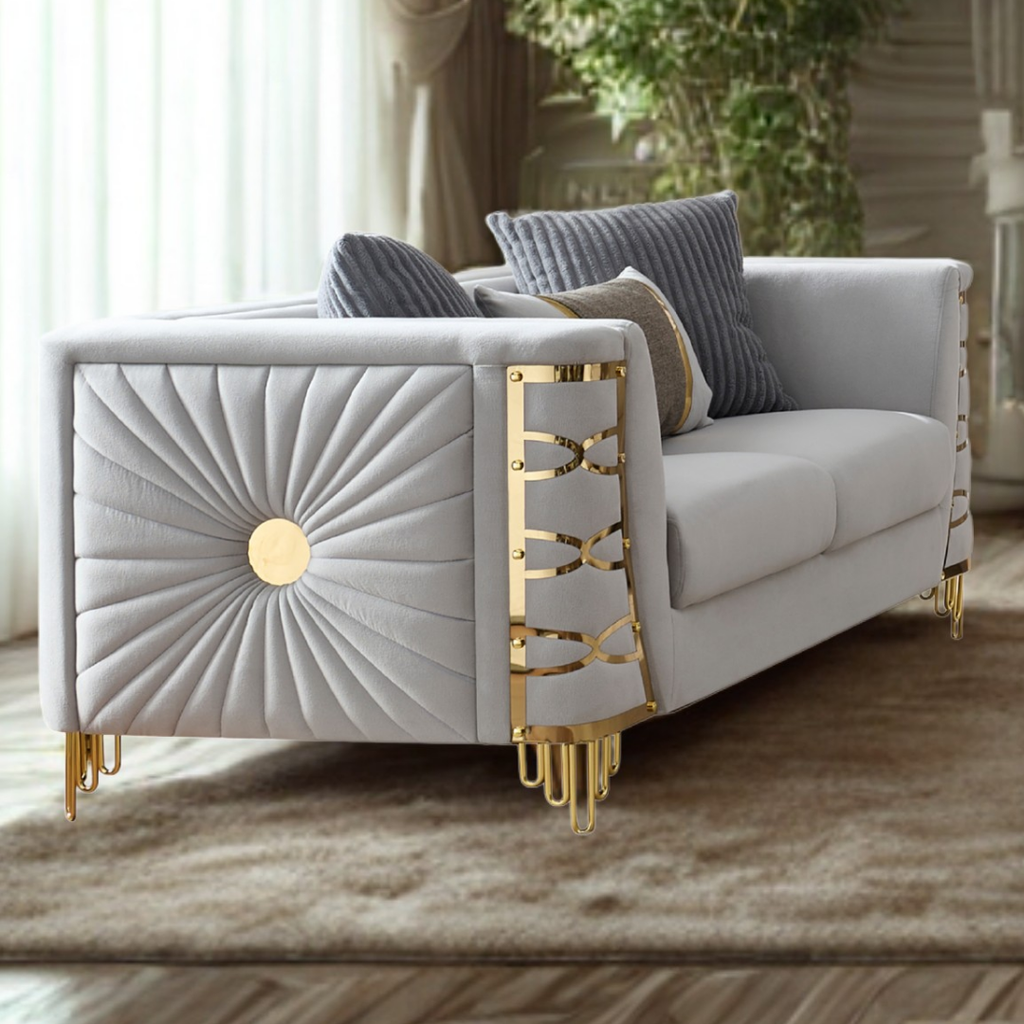 The Saryk Gray Collection delivers a sophisticated blend of contemporary elegance and everyday comfort. Wrapped in smooth grey velvet, each piece showcases sculptural quilting and striking gold metal accents that instantly elevate the room’s aesthetic. The deep cushions offer exceptional relaxation, while the reinforced frame ensures long-lasting durability. This set is ideal for modern homes seeking a statement ensemble with luxurious texture and timeless presence.