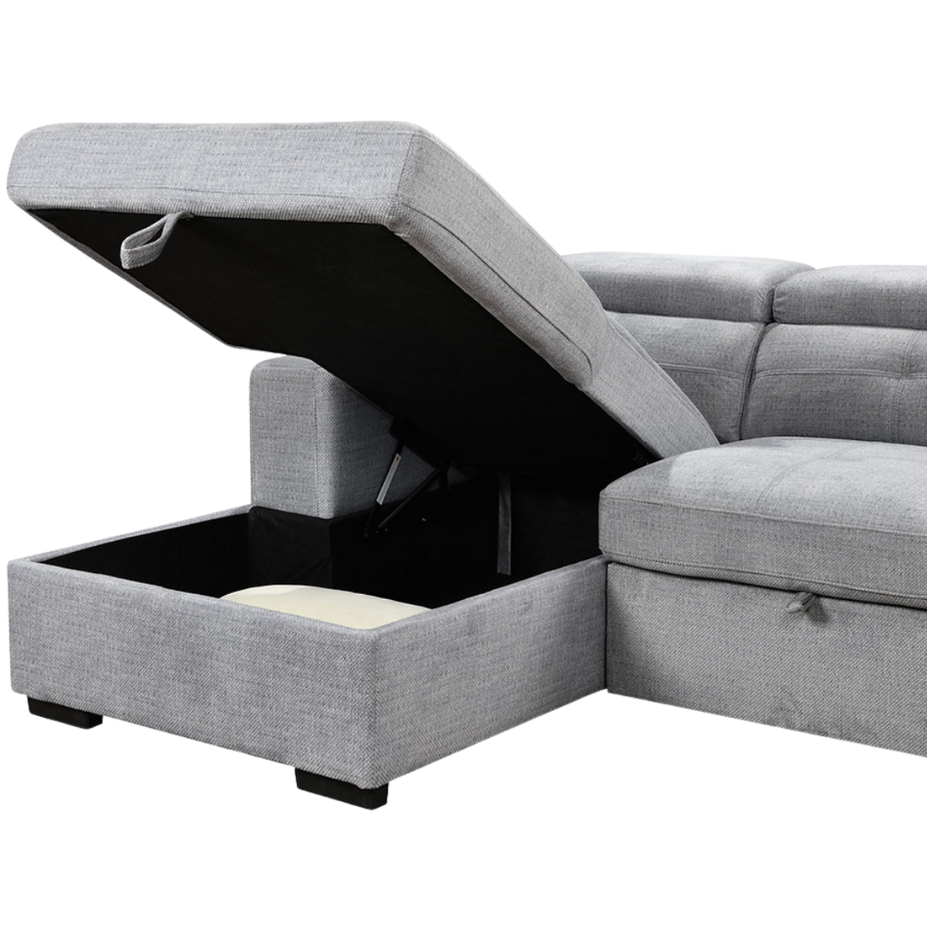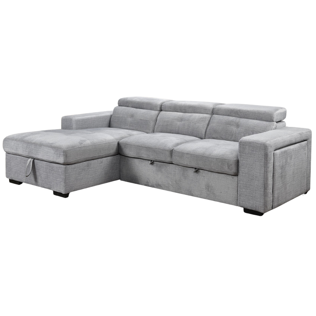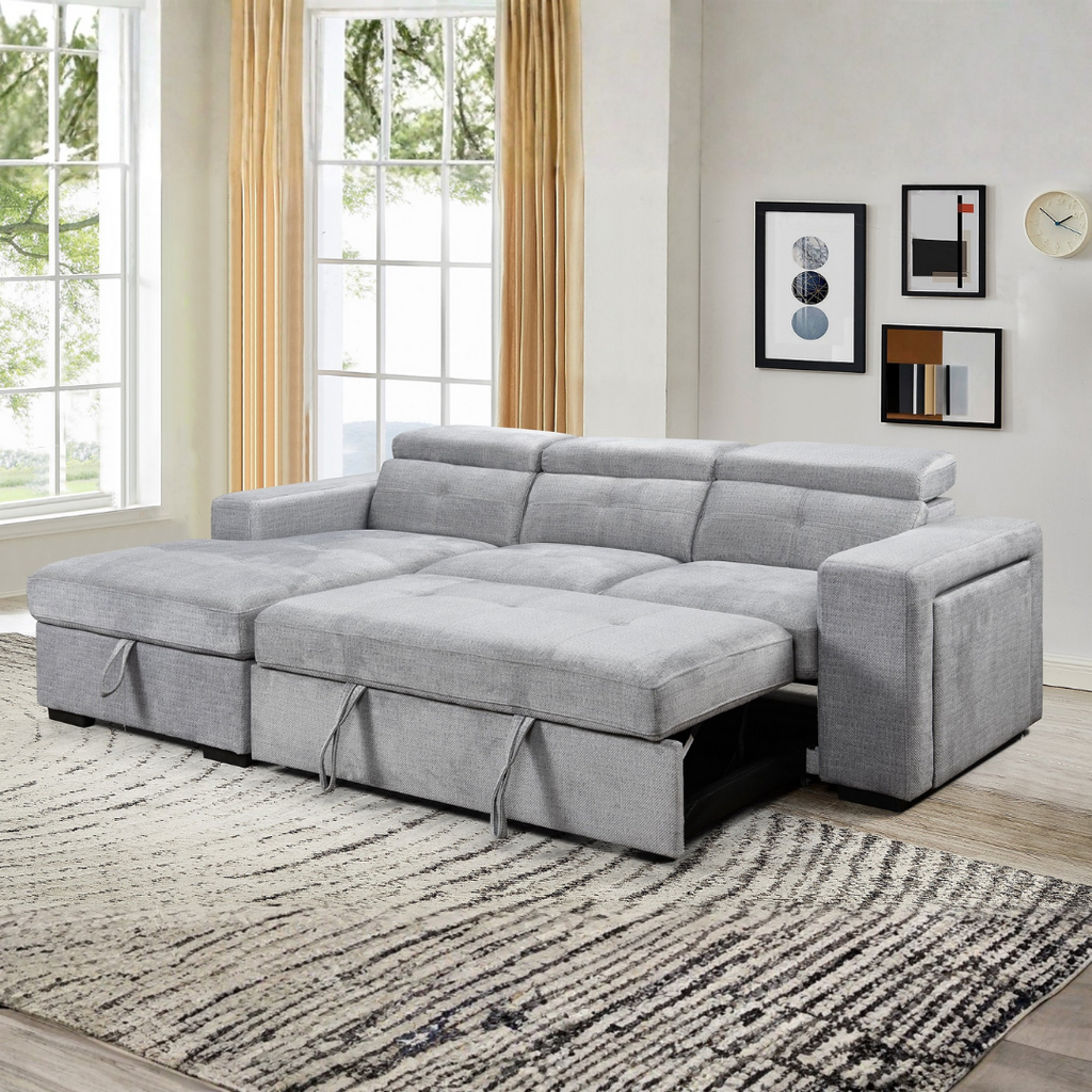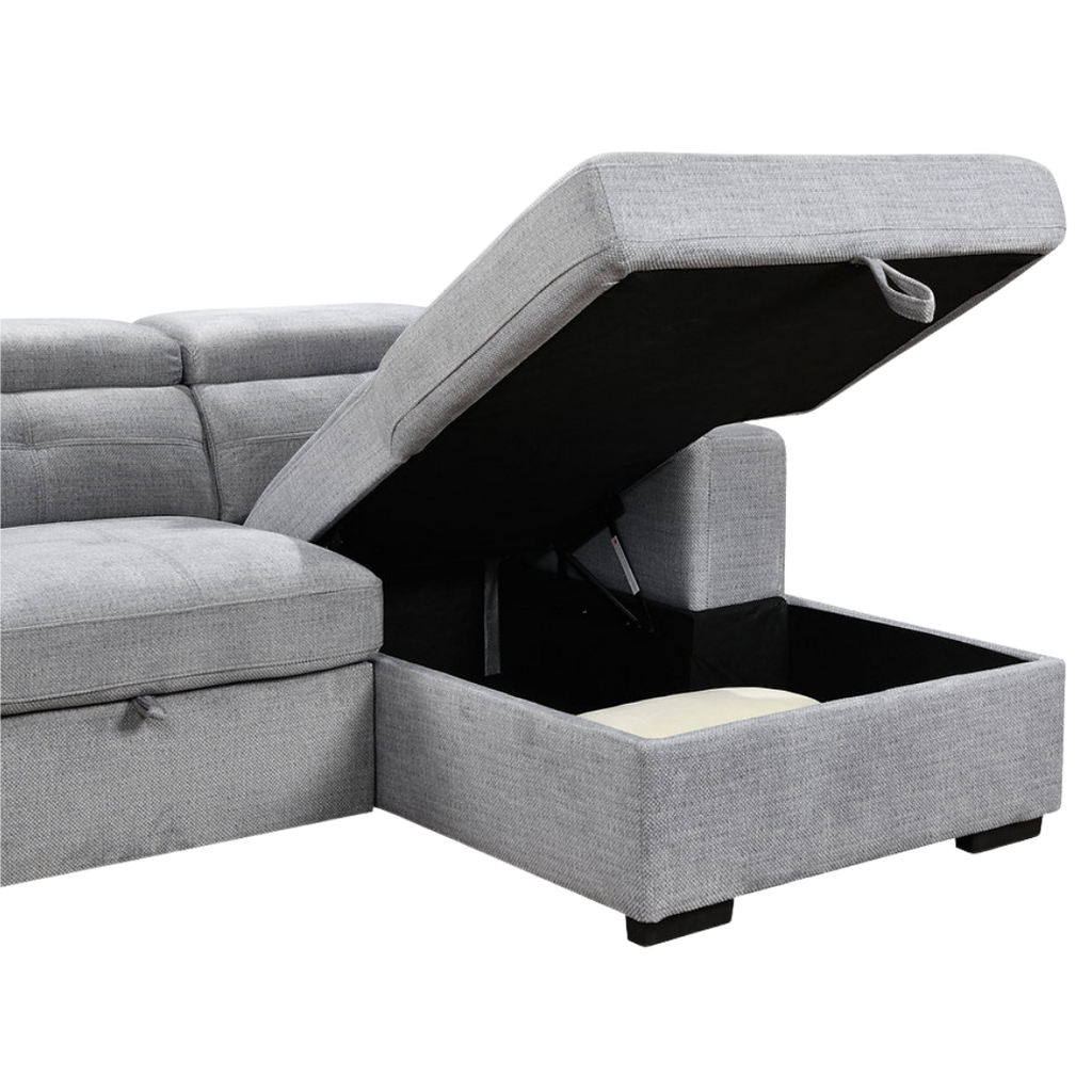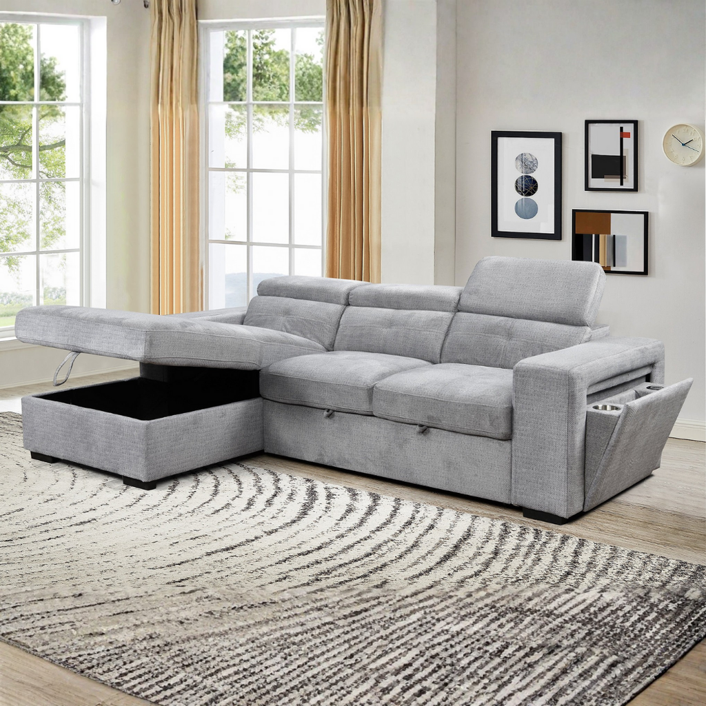 A multifunctional grey sofa bed sectional featuring adjustable headrests, a pull-out sleeper, built-in charging, and large integrated storage. Available in left- or right-hand facing chaise to fit any room layout.