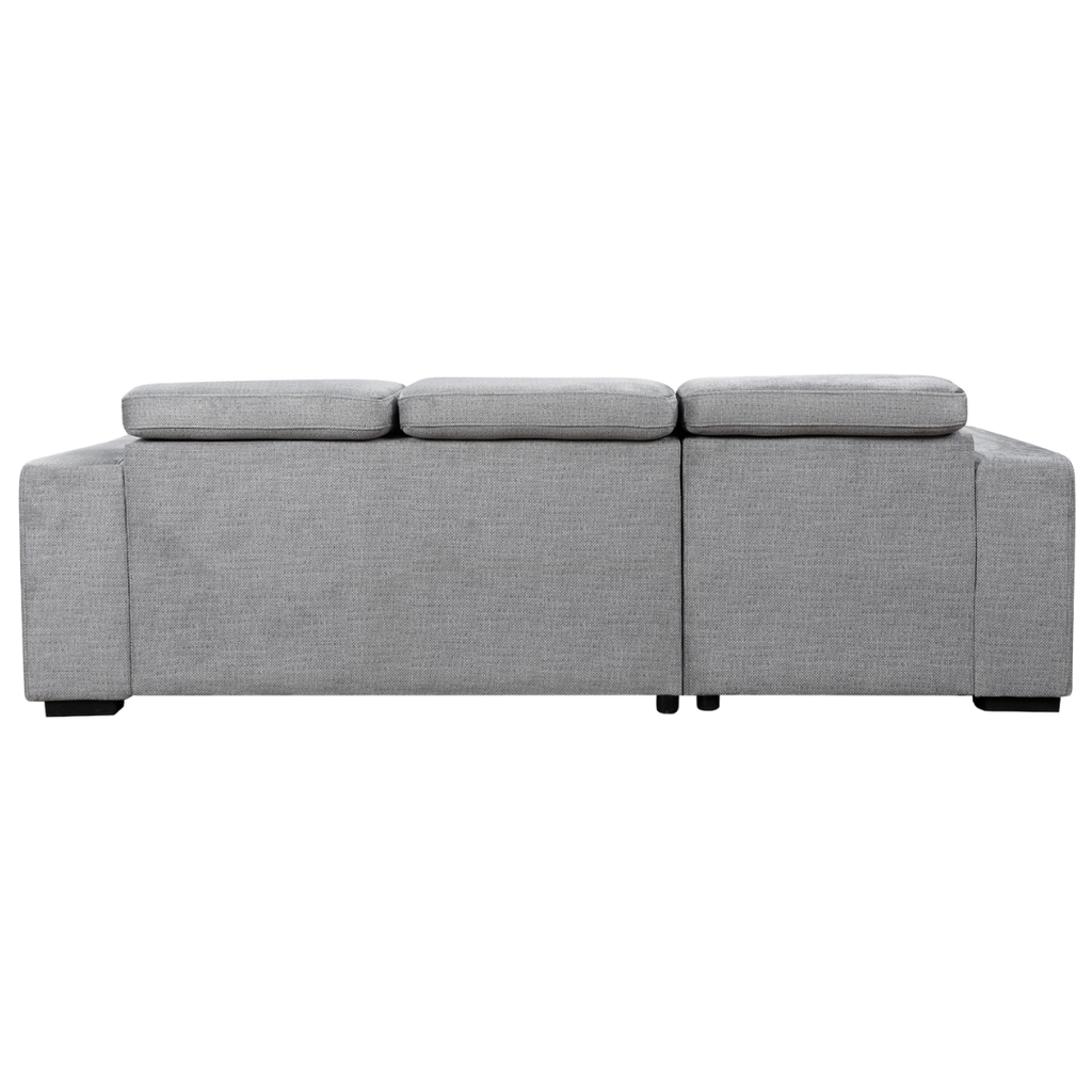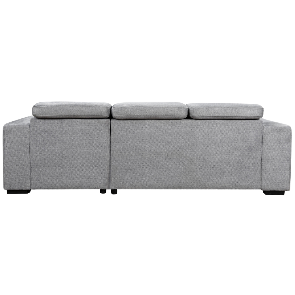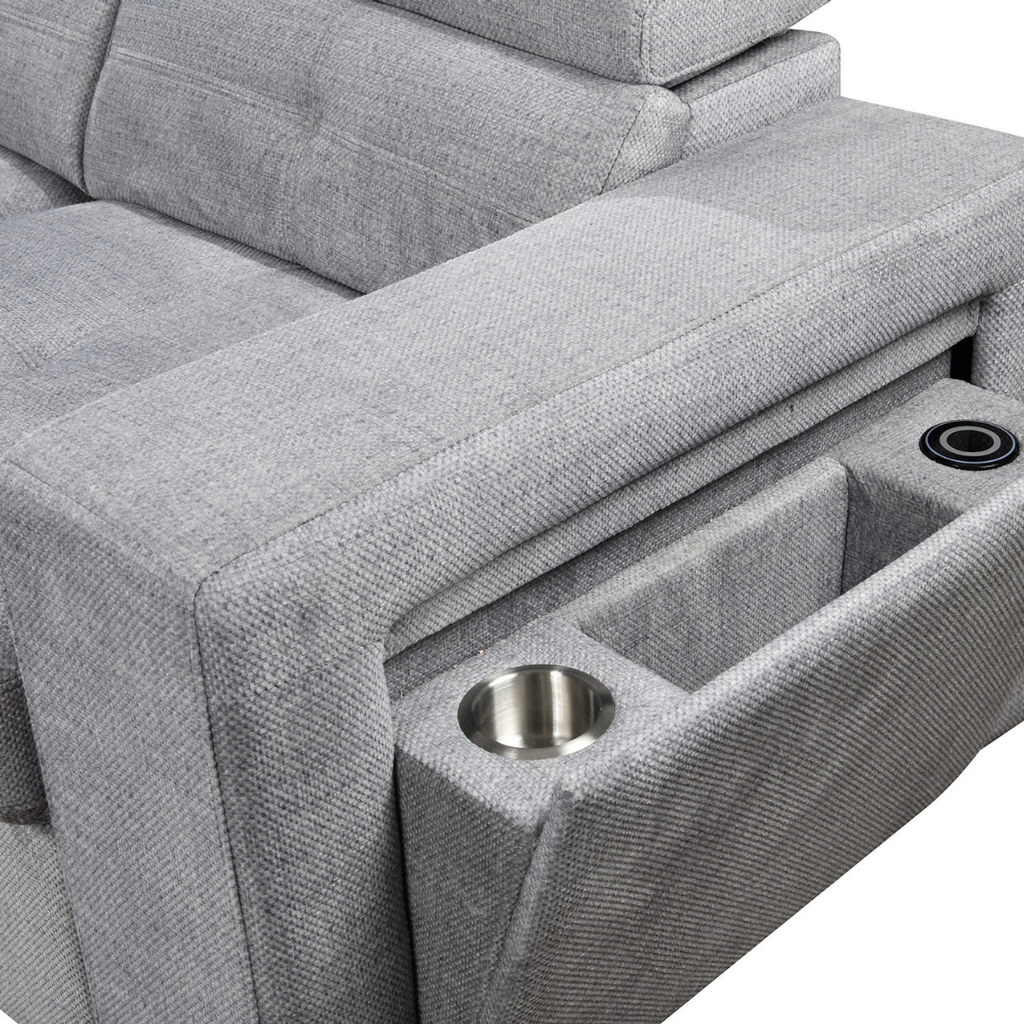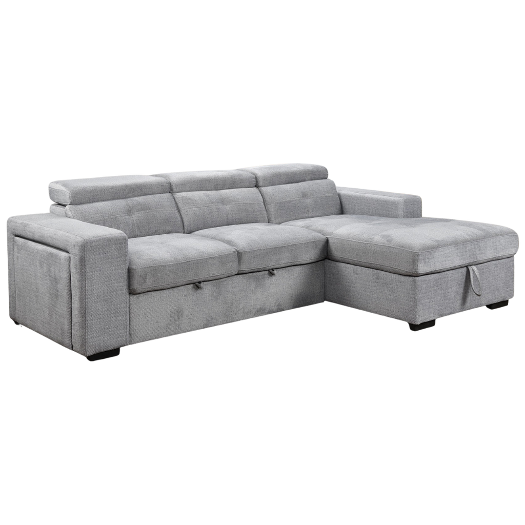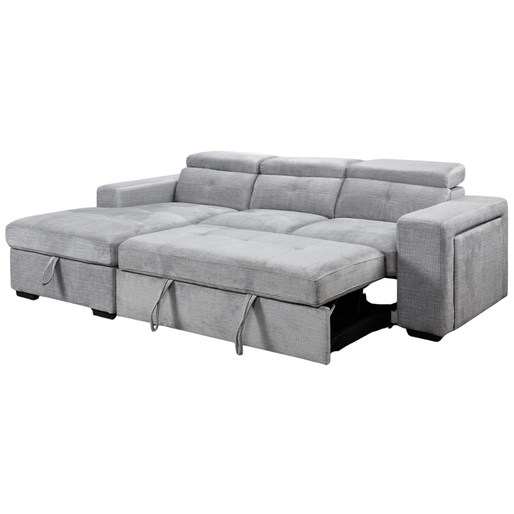 A multifunctional grey sofa bed sectional featuring adjustable headrests, a pull-out sleeper, built-in charging, and large integrated storage. Available in left- or right-hand facing chaise to fit any room layout.