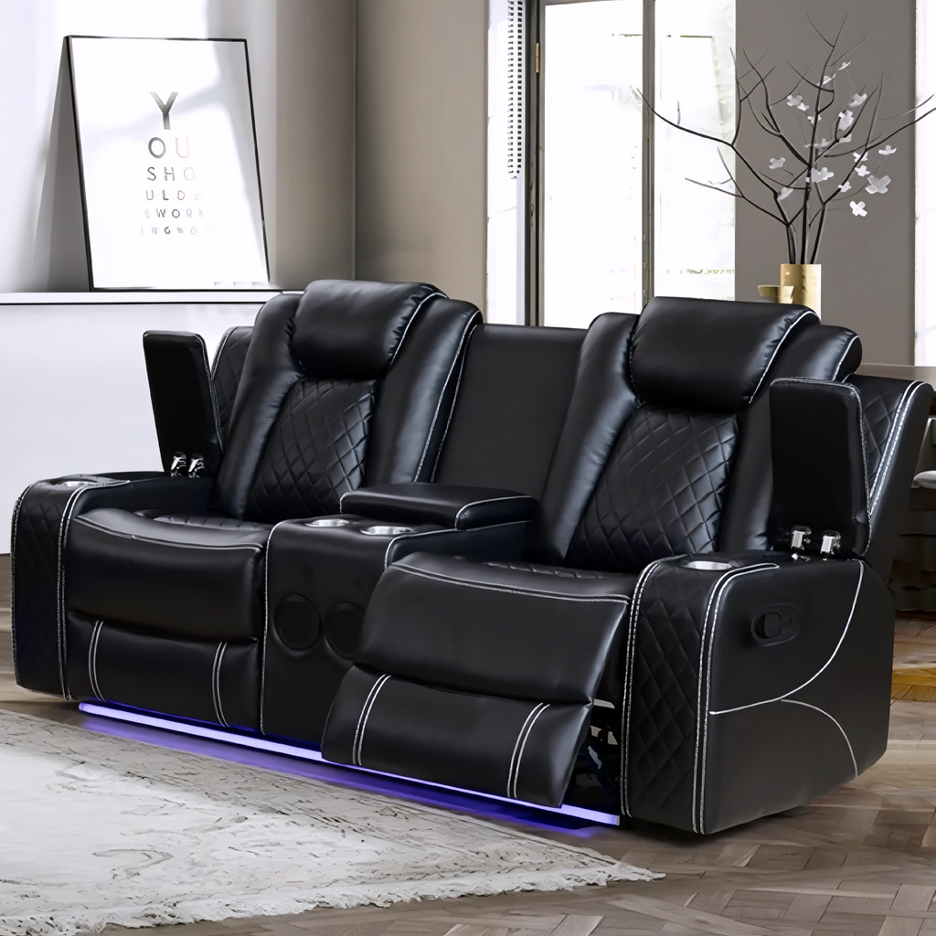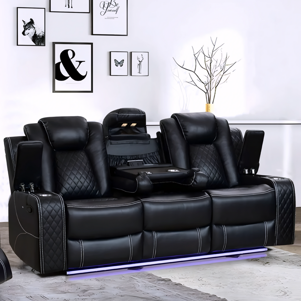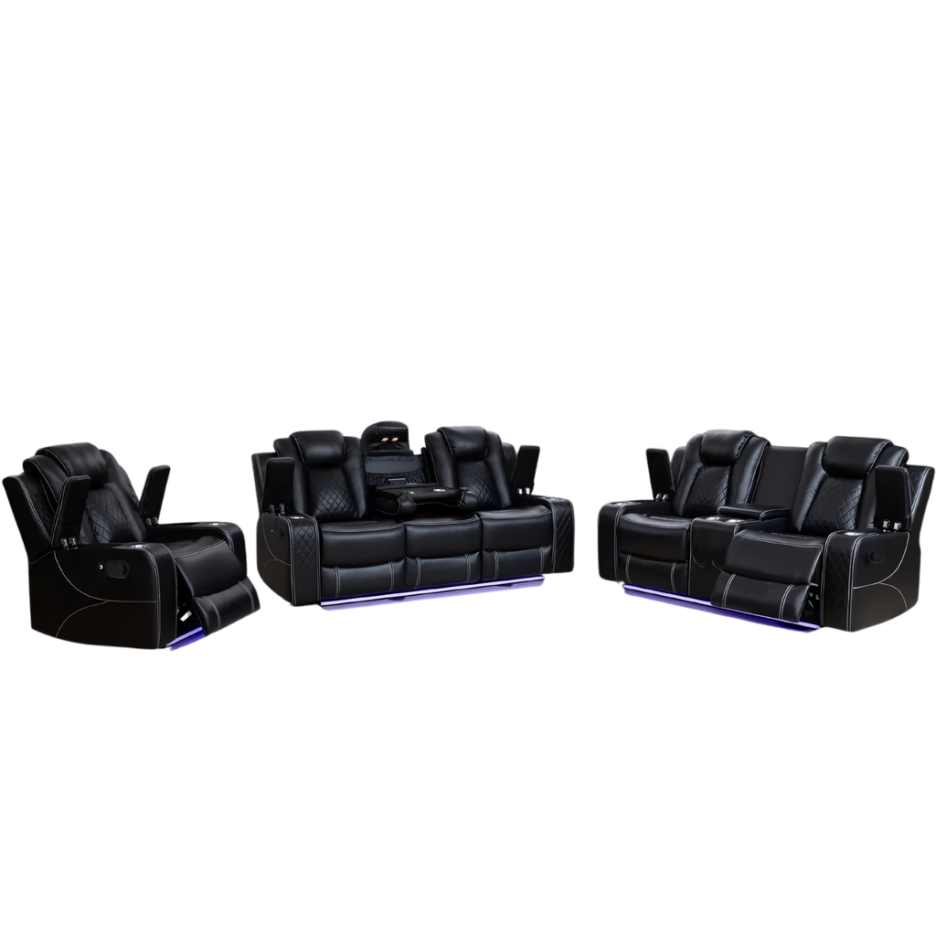 A premium black air-leather power recliner set featuring LED base lighting, quilted detailing, and multiple powered seating options. Designed for modern entertainment spaces, the set combines deep comfort, high-end styling, and functional features for everyday lounging or home-theatre environments.
