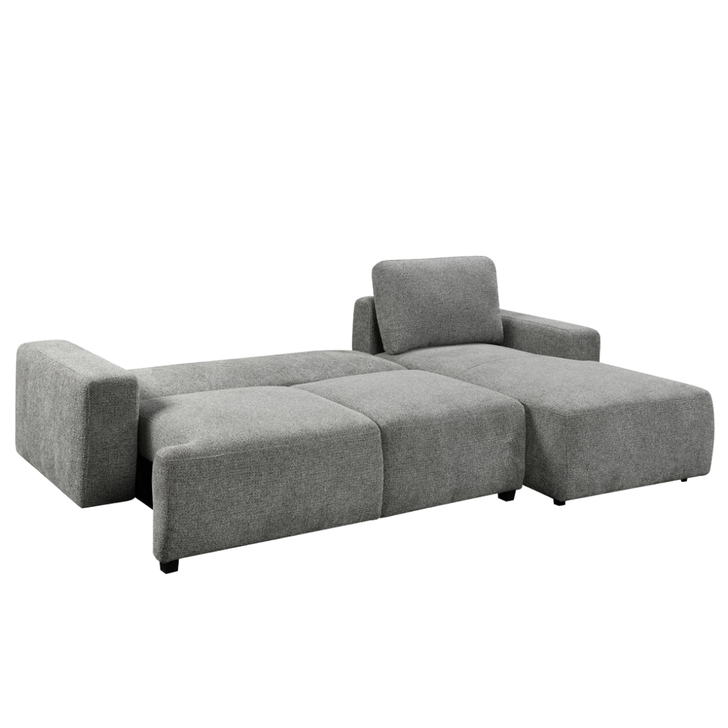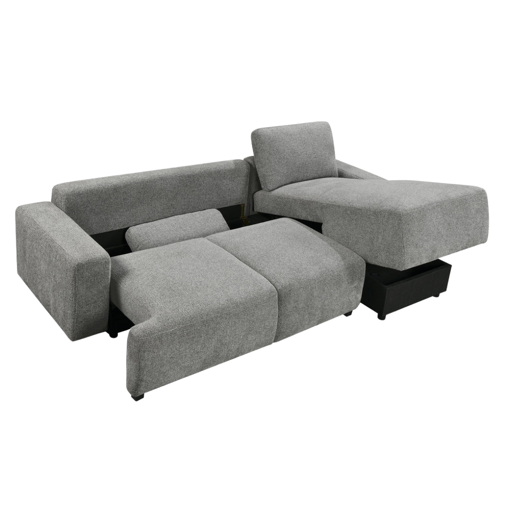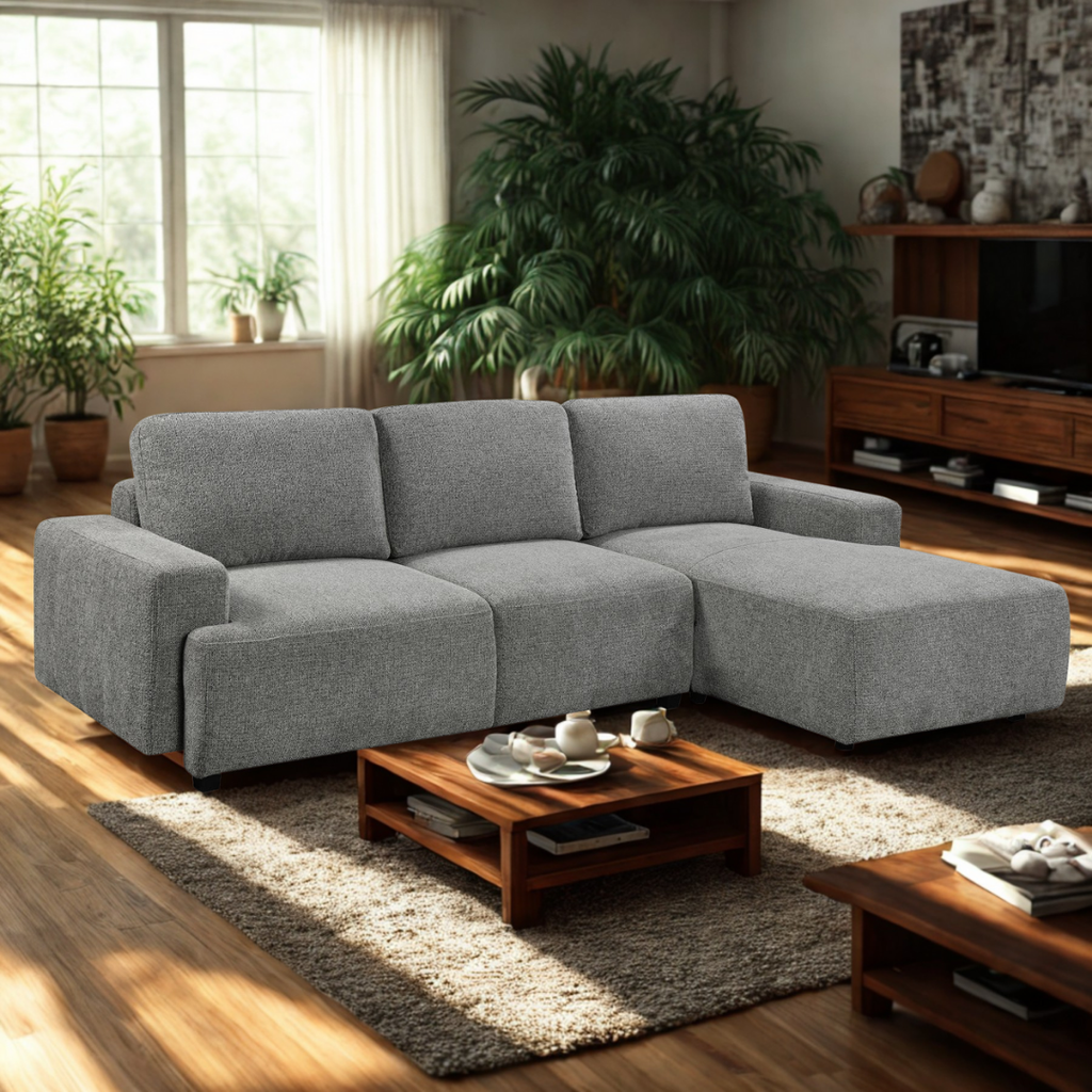 The Soreva sectional brings a clean, streamlined profile to modern living spaces. Its wide arms, deep seating, and low silhouette create a relaxed, contemporary look perfect for everyday living. Upholstered in a soft grey woven fabric, it blends seamlessly into neutral or modern interiors.