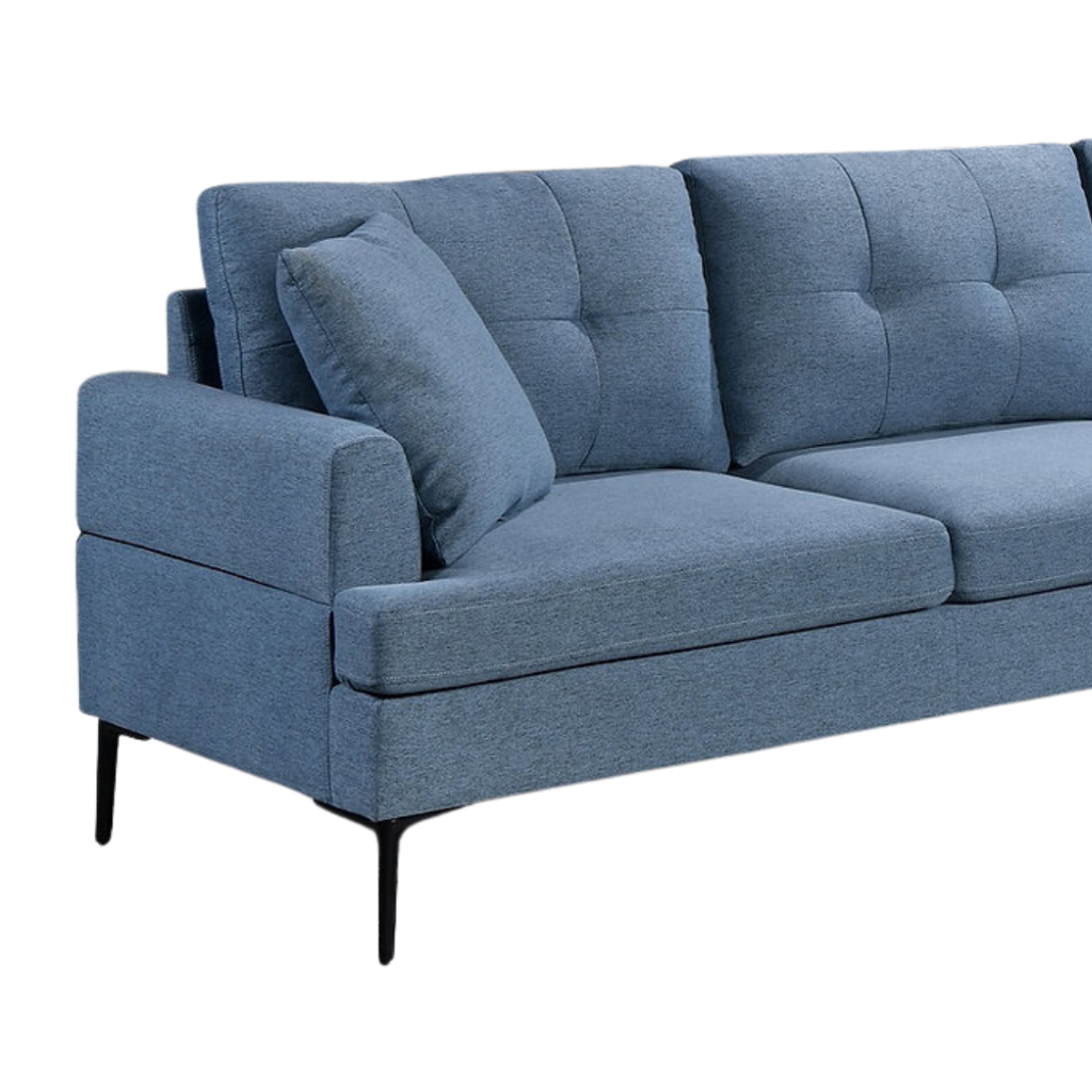 The tufted cushions and clean silhouette deliver a balanced modern look, while the black metal legs add structure and contrast.