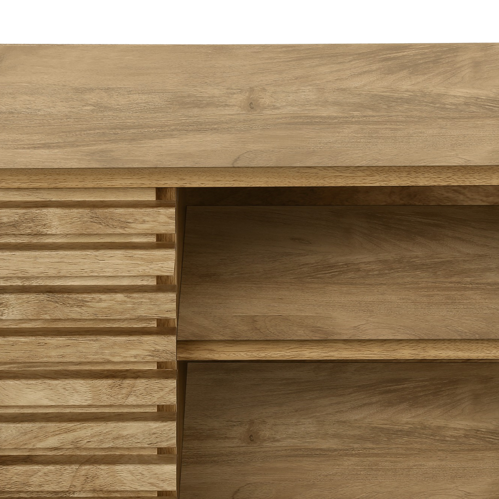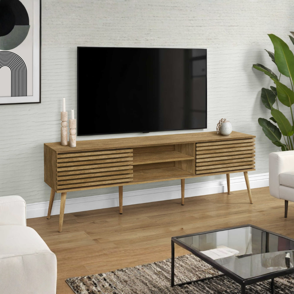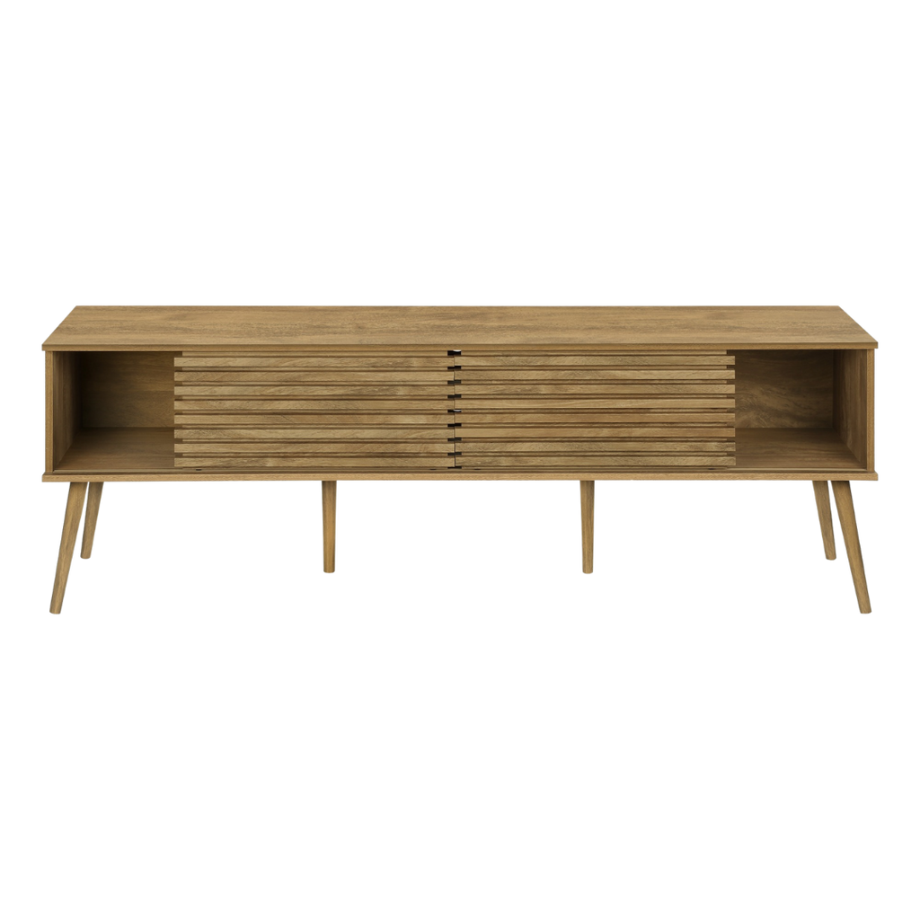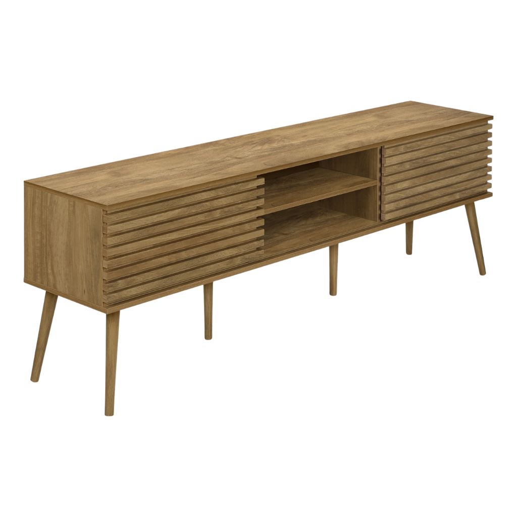 A contemporary 72-inch walnut TV stand combining open shelves and sliding-door storage. Velon delivers a retro panelled design, solid wood legs, and clean cable management—ideal for modern living rooms seeking style, practicality, and easy organization.