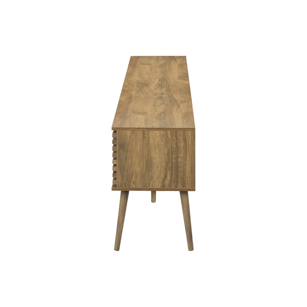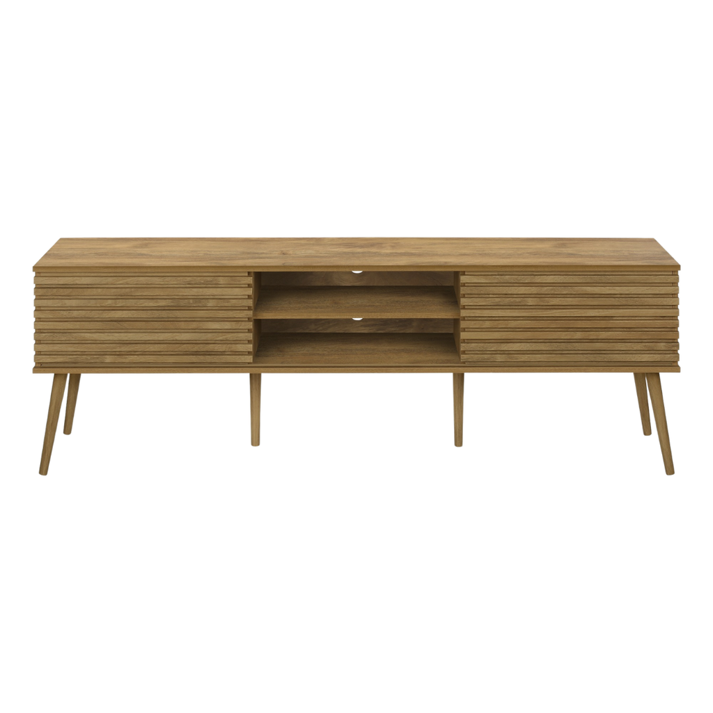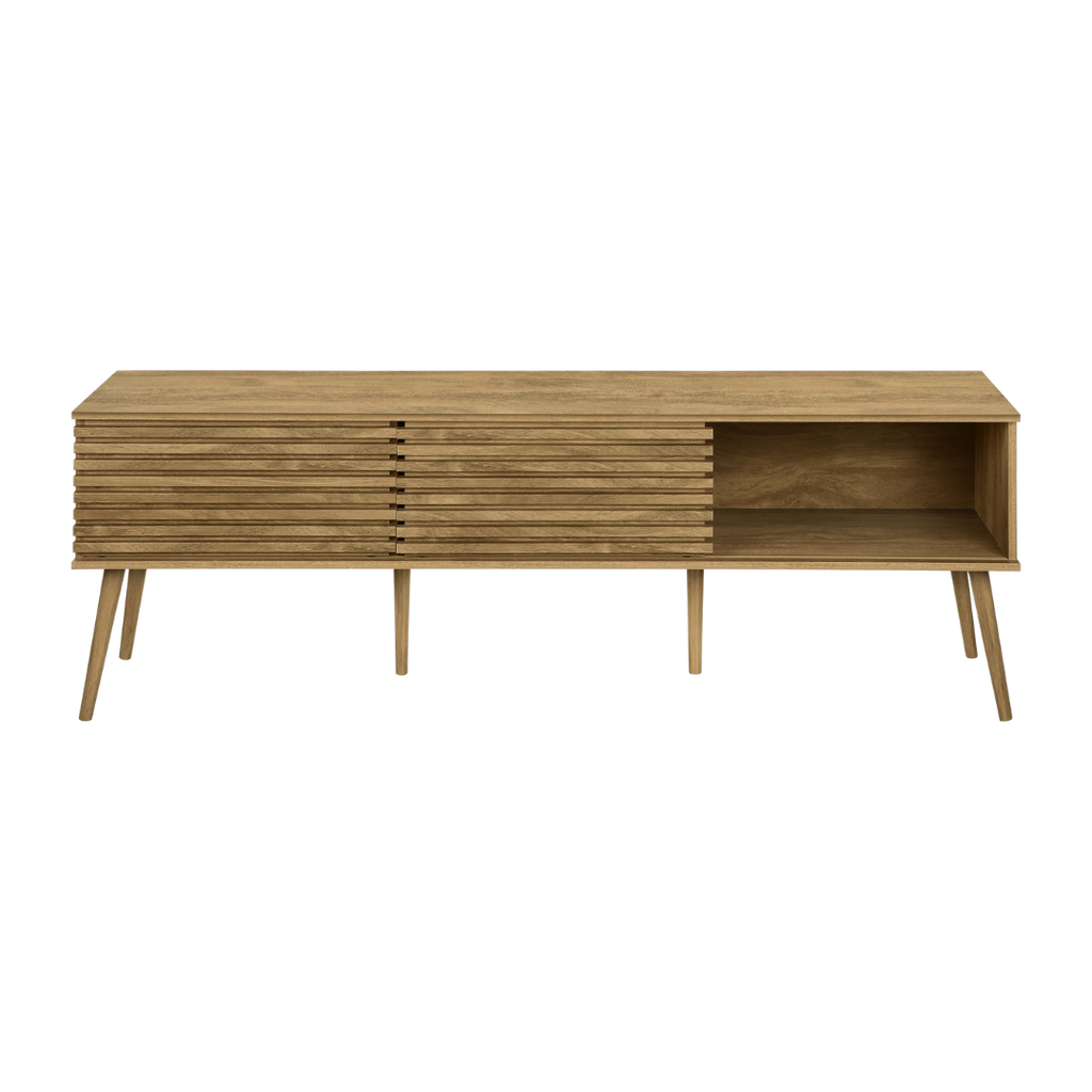 The Velon TV stand blends mid-century inspiration with functional storage. Two sliding doors provide flexible hidden storage, while the centre shelves are perfect for showcasing media components. The elevated wood legs and walnut finish add a warm, modern touch to any space. Designed for everyday use, the structure remains stable and easy to maintain with a simple wipe-clean top.