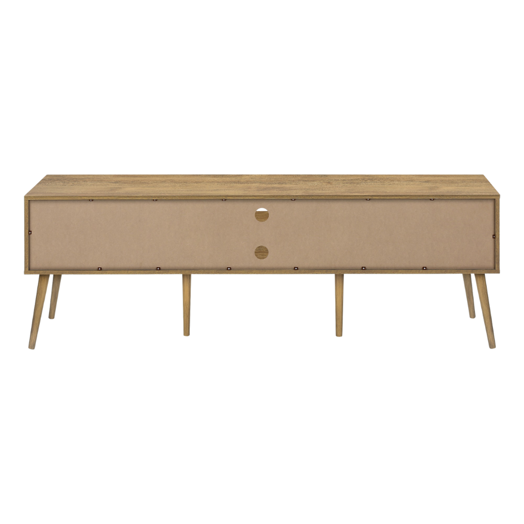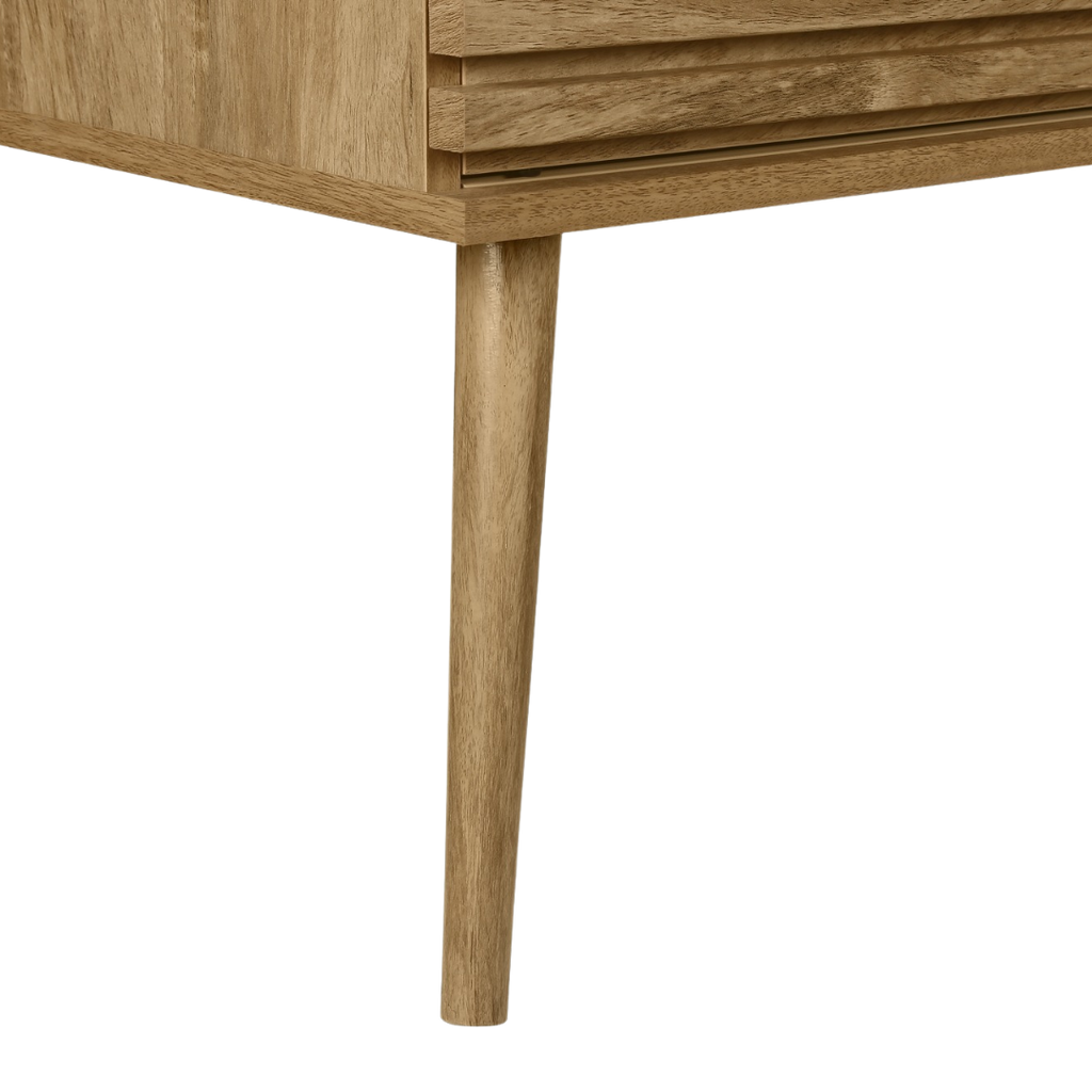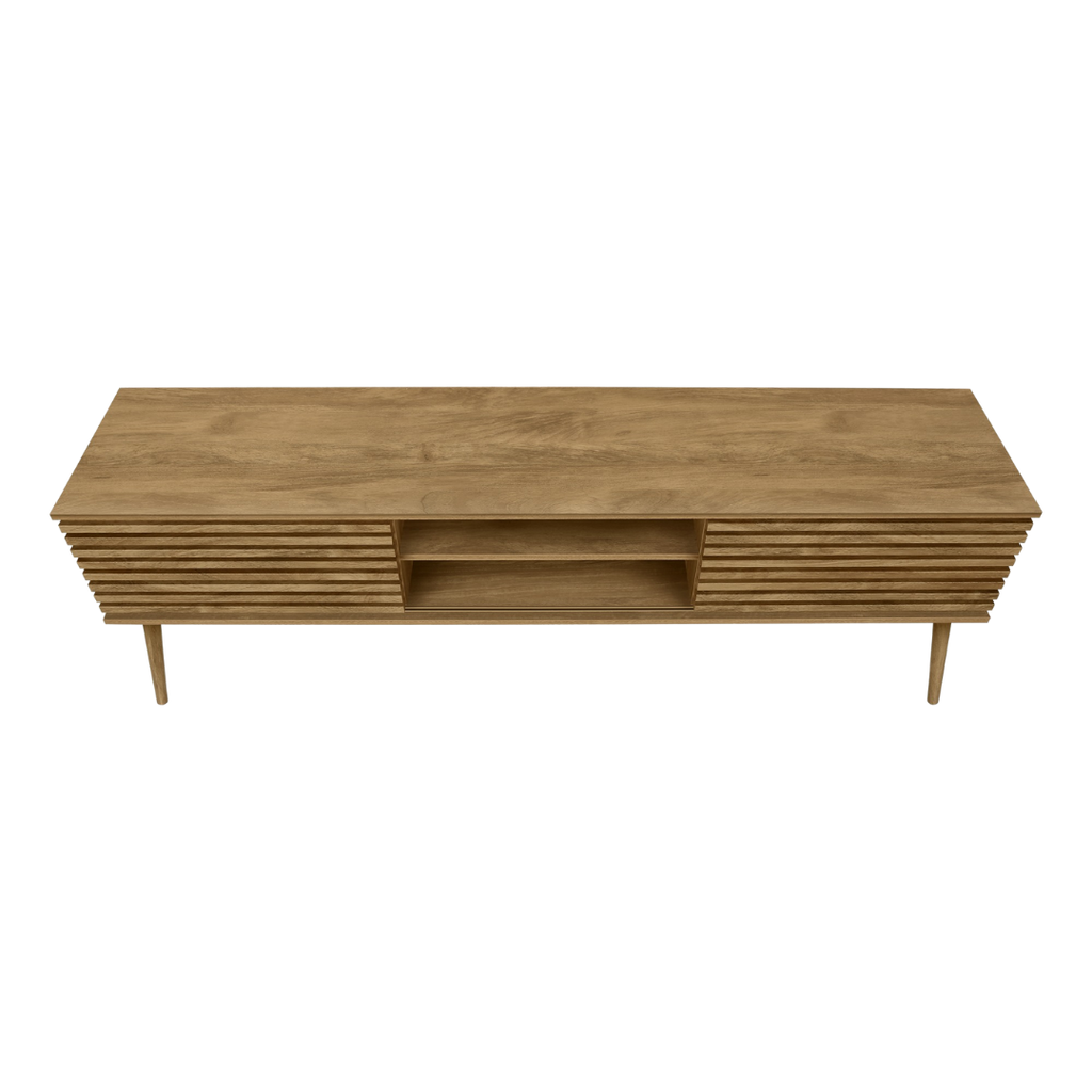 The Velon TV stand blends mid-century inspiration with functional storage. Two sliding doors provide flexible hidden storage, while the centre shelves are perfect for showcasing media components. The elevated wood legs and walnut finish add a warm, modern touch to any space. Designed for everyday use, the structure remains stable and easy to maintain with a simple wipe-clean top.