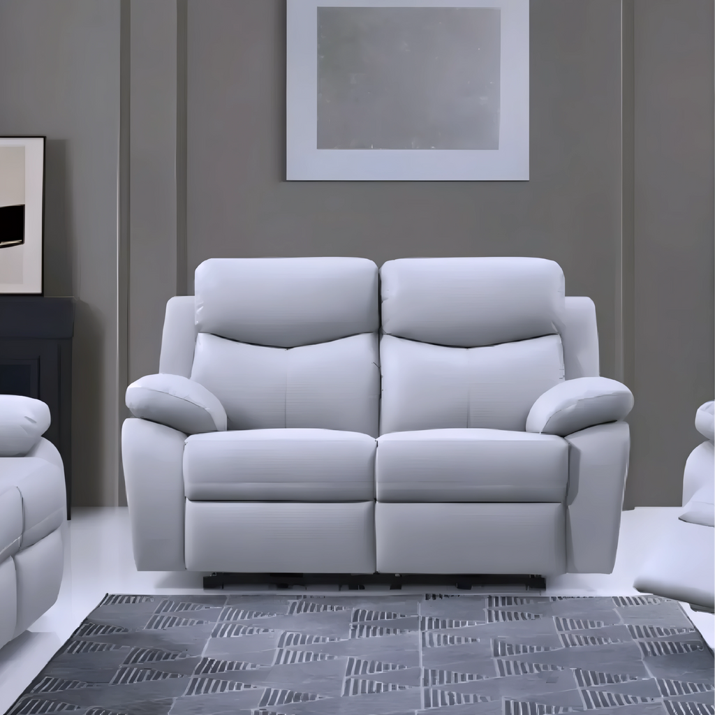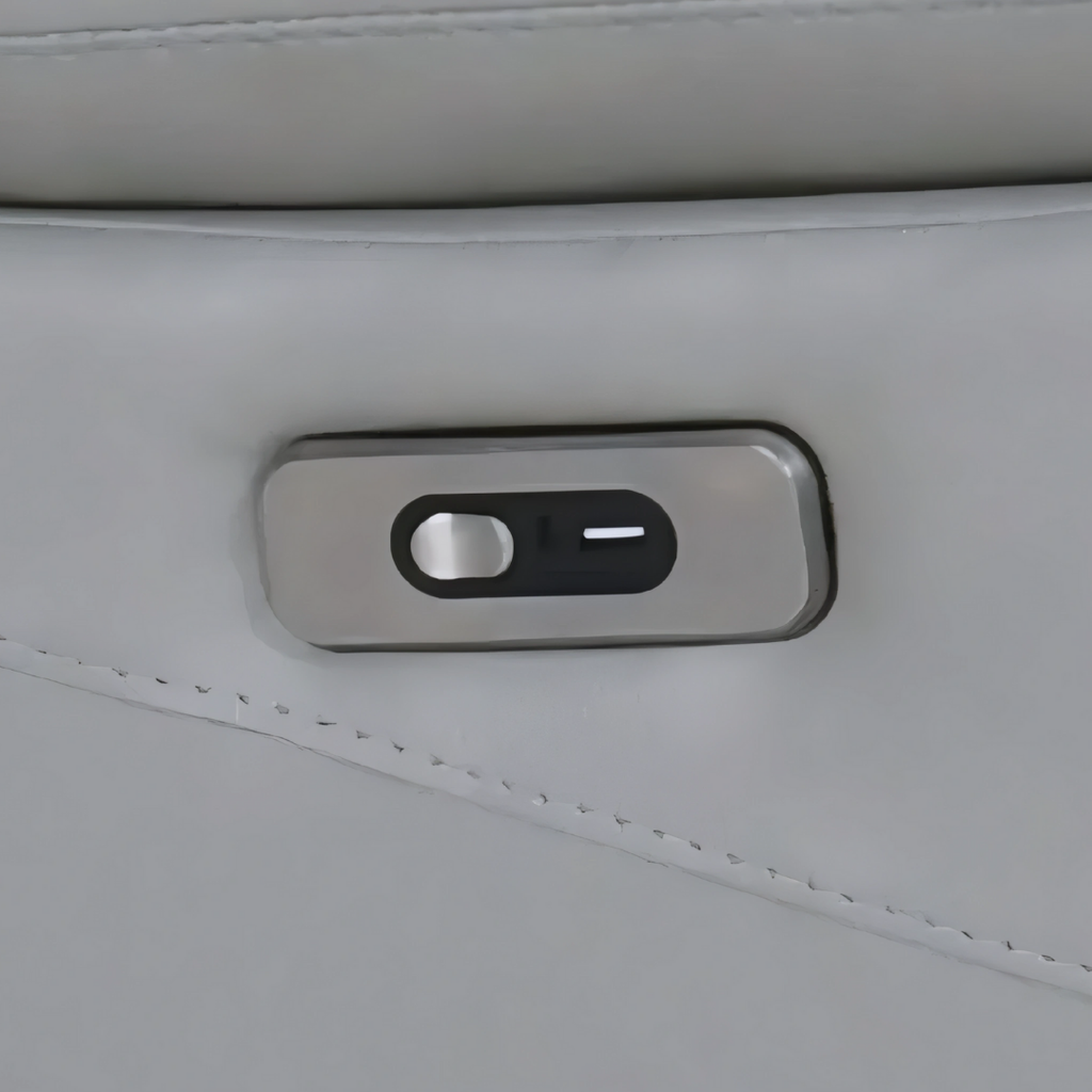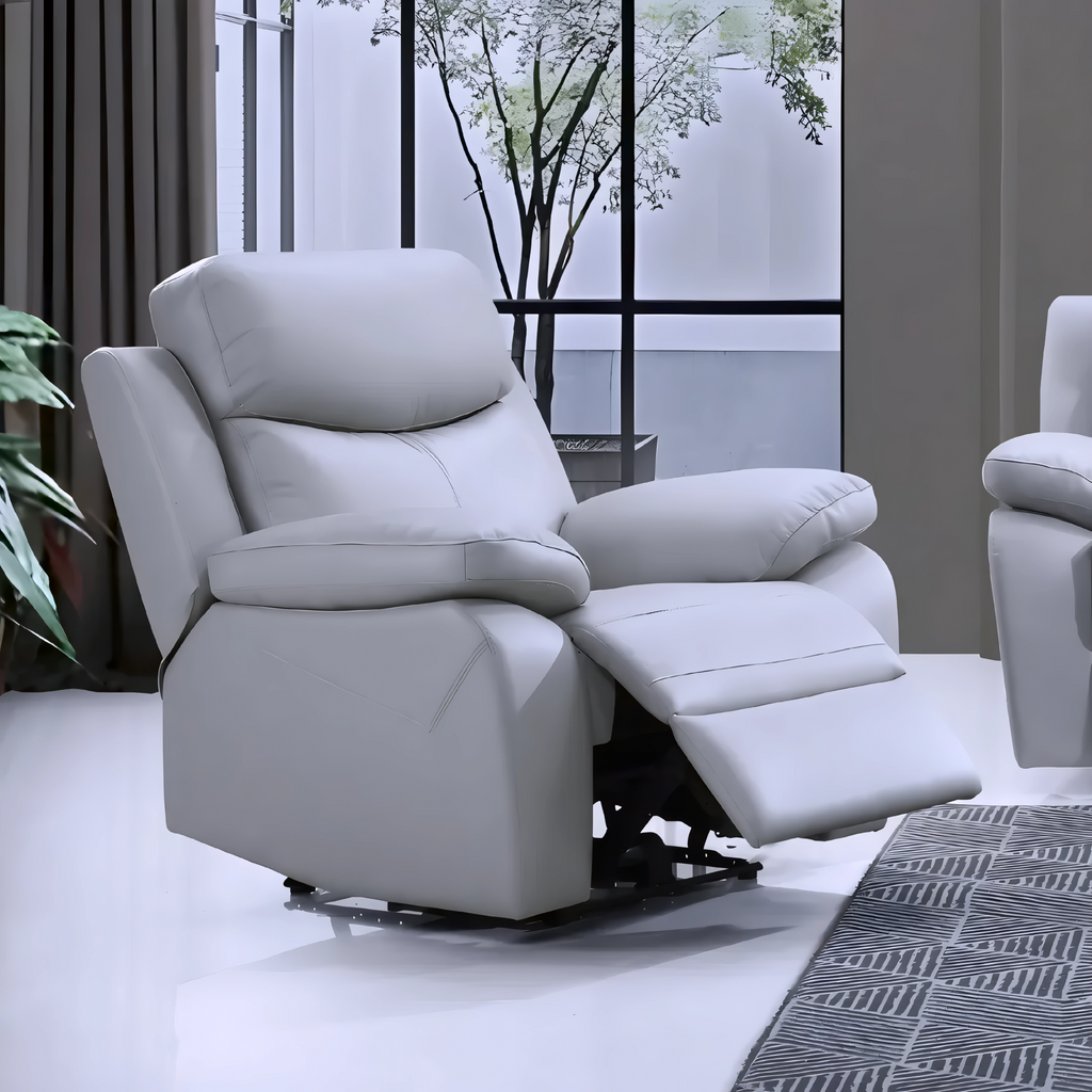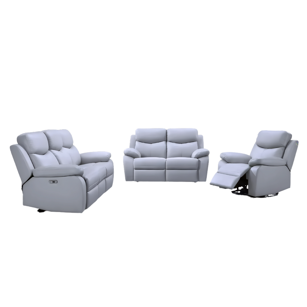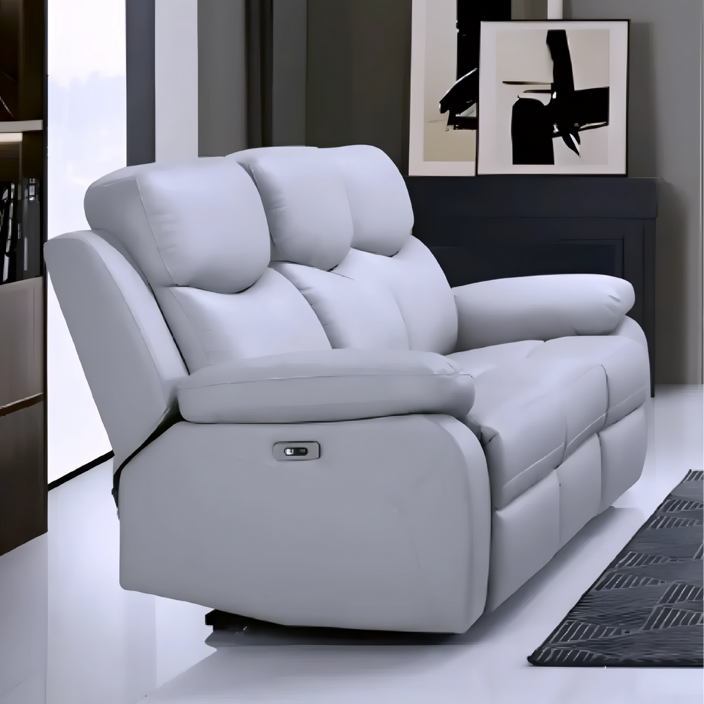 A premium power recliner set in light grey genuine leather-match, designed for elevated comfort with smooth power mechanisms, plush cushioning, and built-in USB charging.