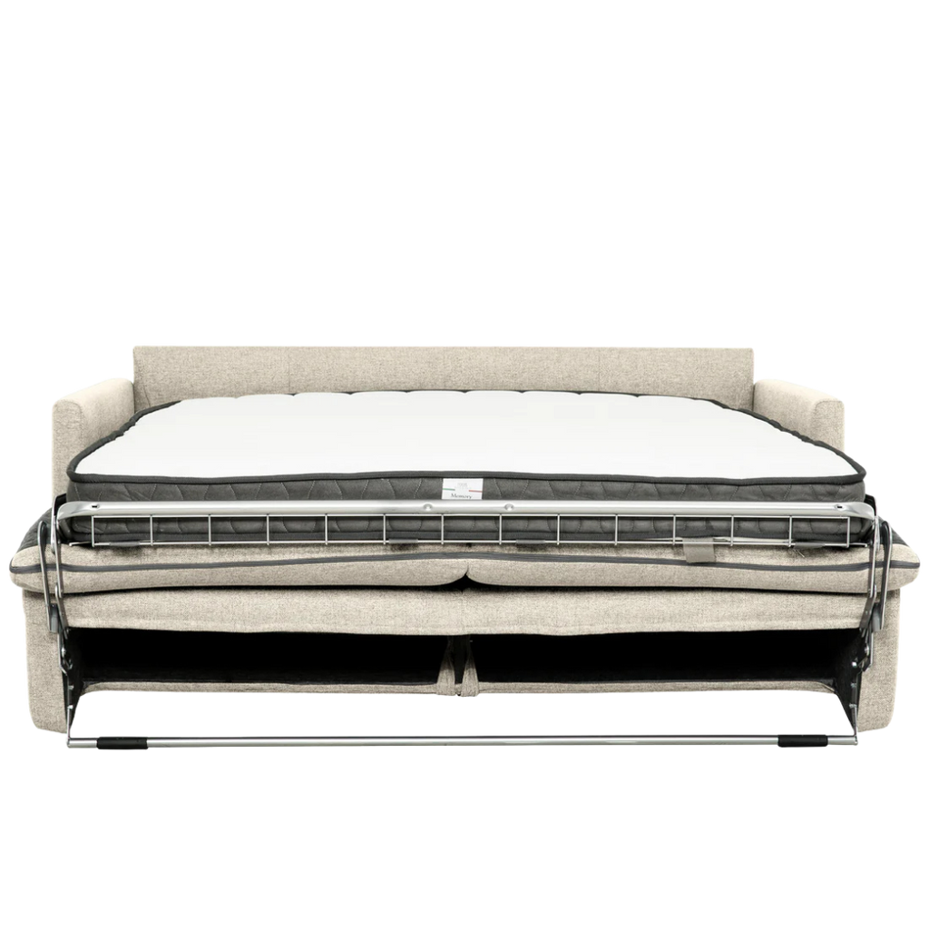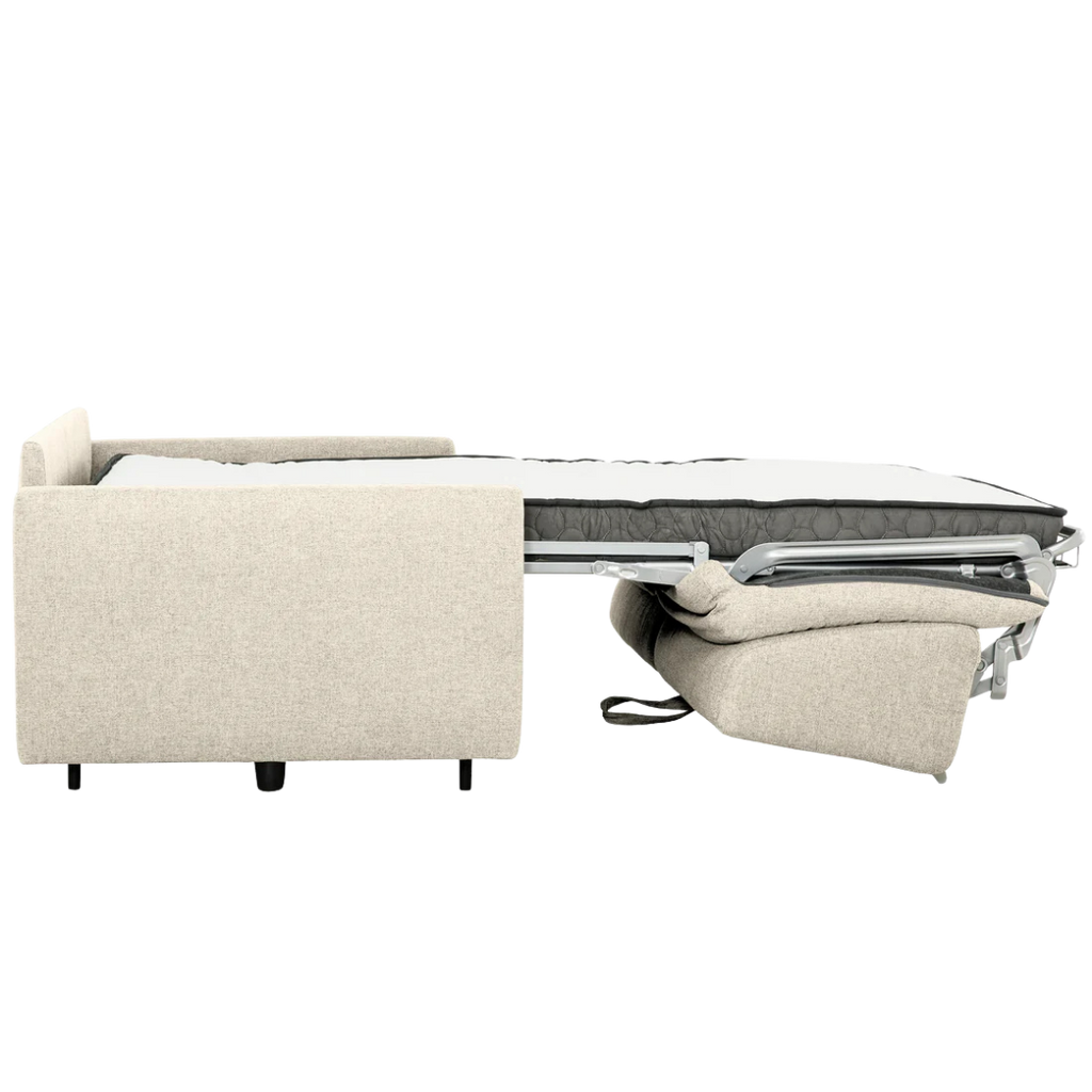 A compact Italian-mechanism sofa bed featuring a 5" full-size memory foam mattress, designed for modern living and effortless guest accommodation.