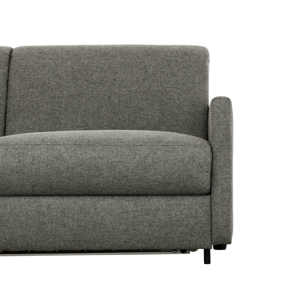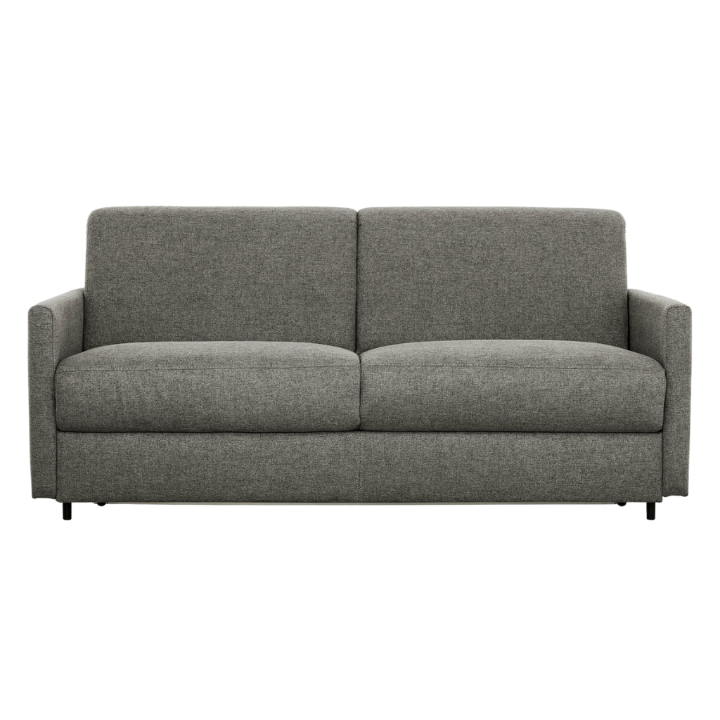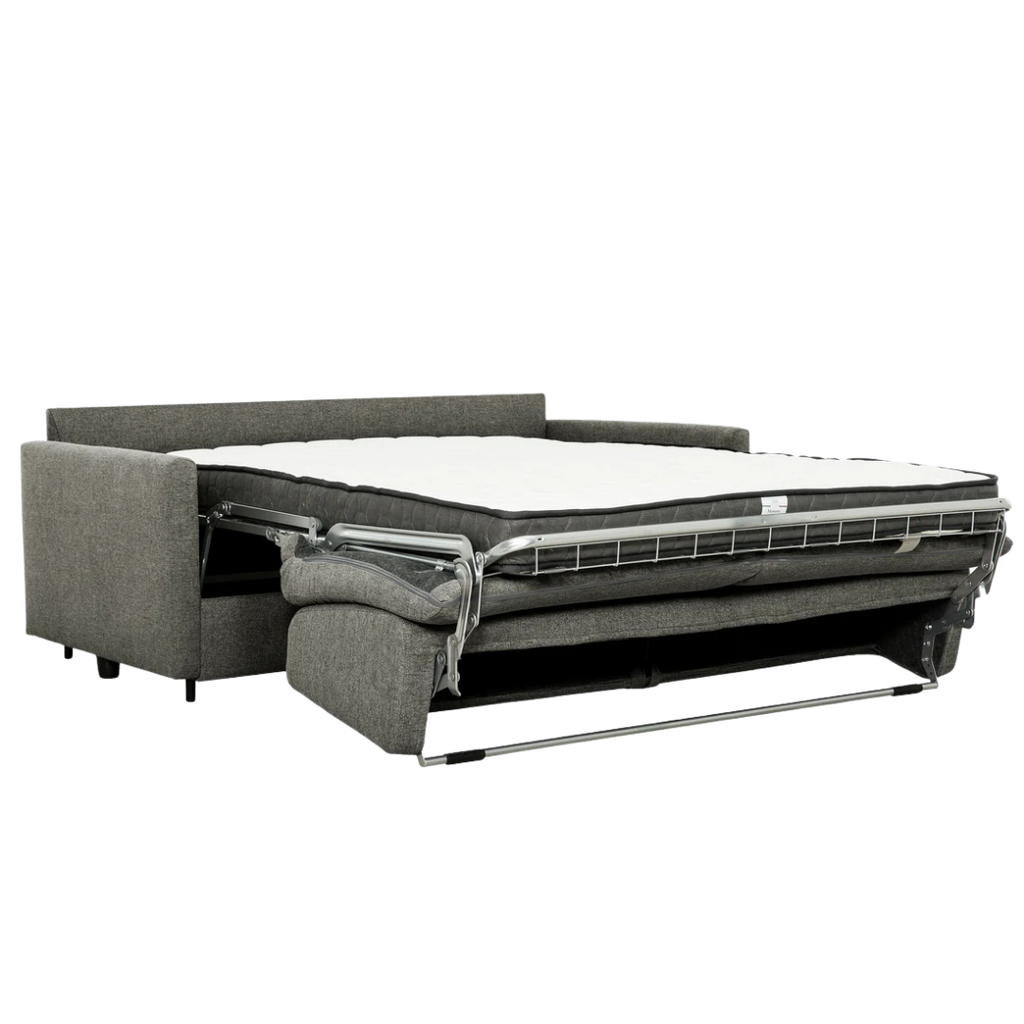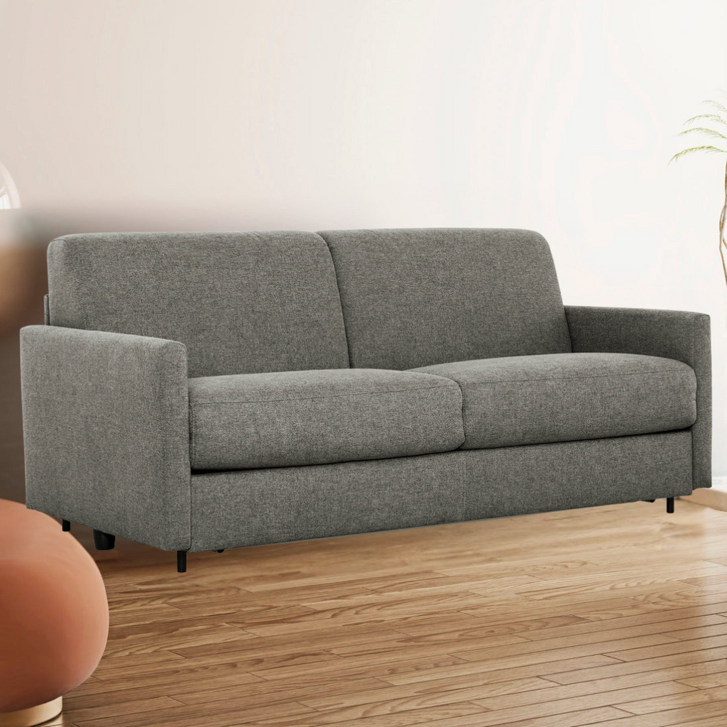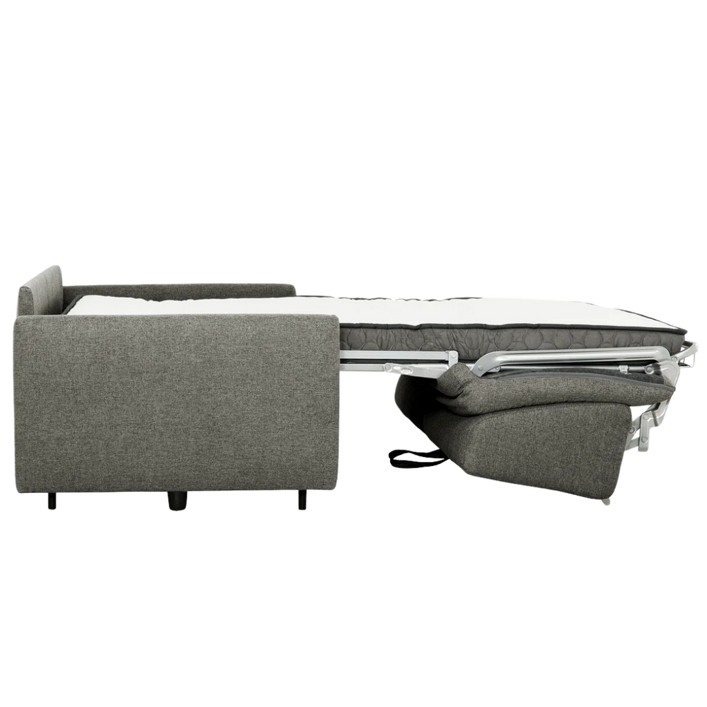 A compact Italian-mechanism sofa bed featuring a 5" full-size memory foam mattress, designed for modern living and effortless guest accommodation.