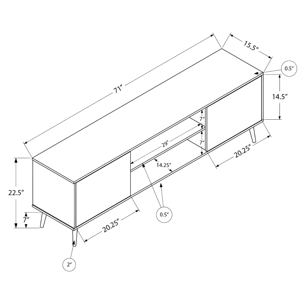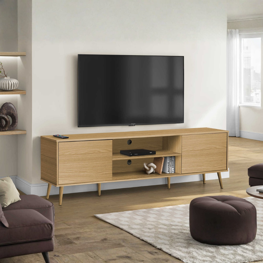 The Zelro TV stand brings a fresh, clean look to any modern space. Its natural laminate finish pairs with solid wood legs to create a warm, refined aesthetic. The open central shelving includes two cable-management holes to keep components neatly organized, while the two side cabinets feature a push-latch system for easy access and a smooth, handle-free profile.