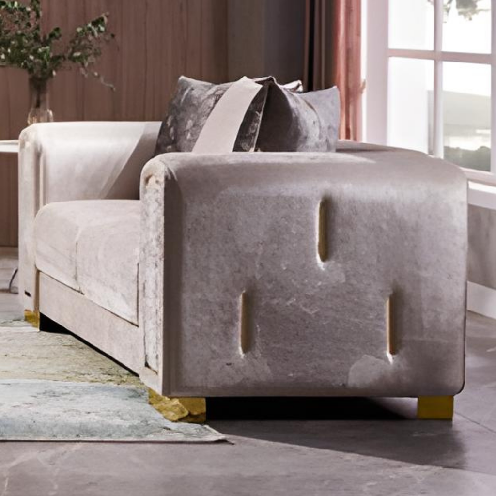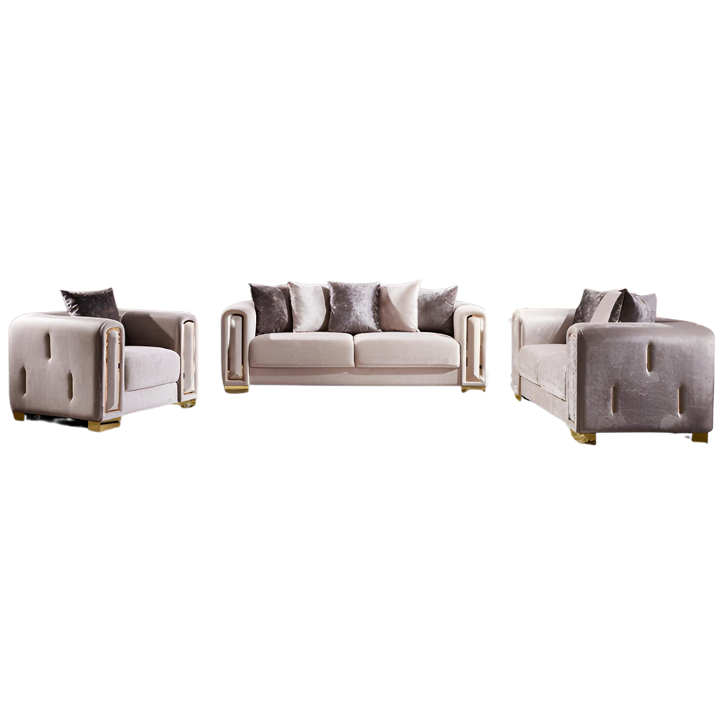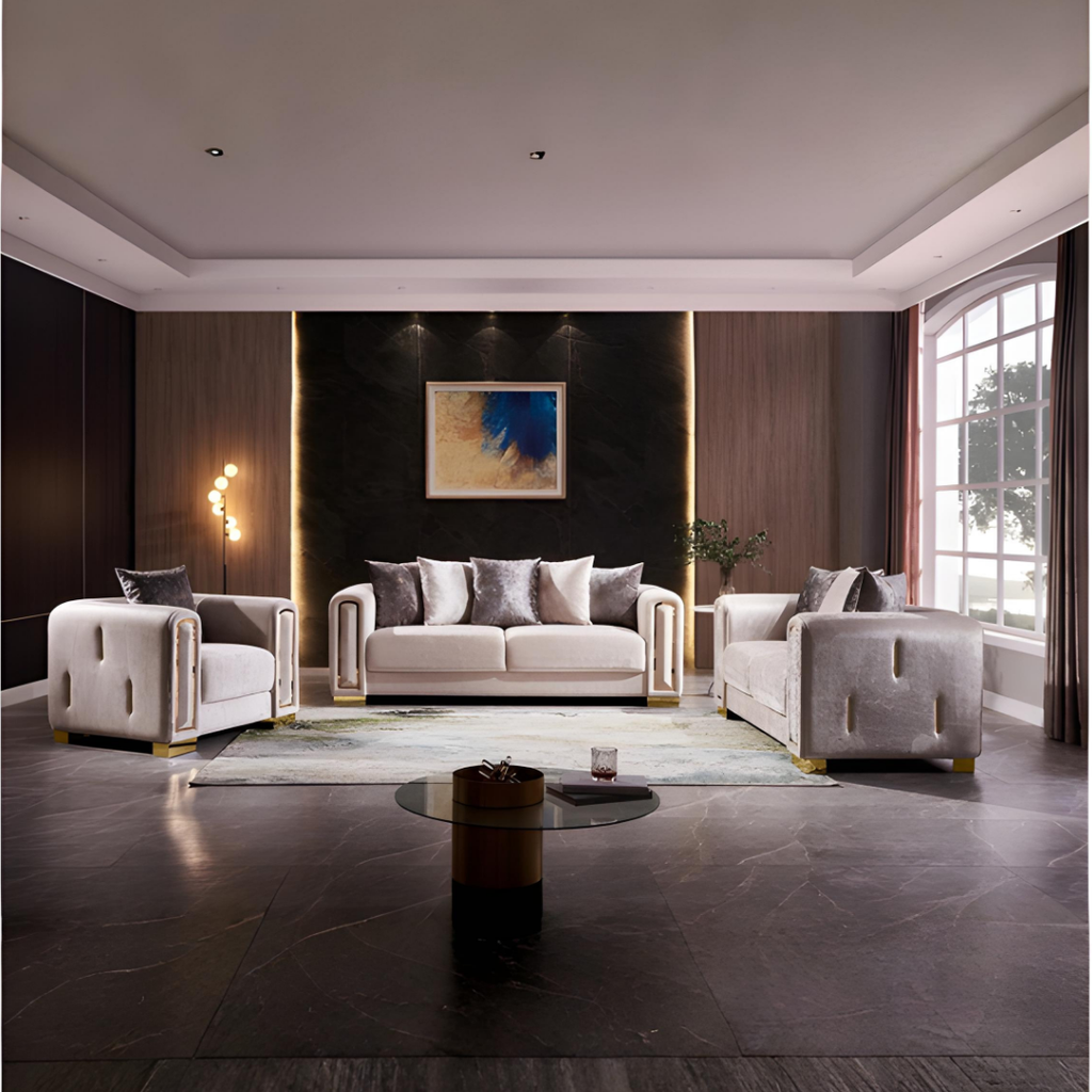 Zeyus Beige brings a modern luxury aesthetic with its smooth velvet-touch upholstery and striking gold detailing. The set delivers premium comfort through high-density seating and a reinforced wood frame.