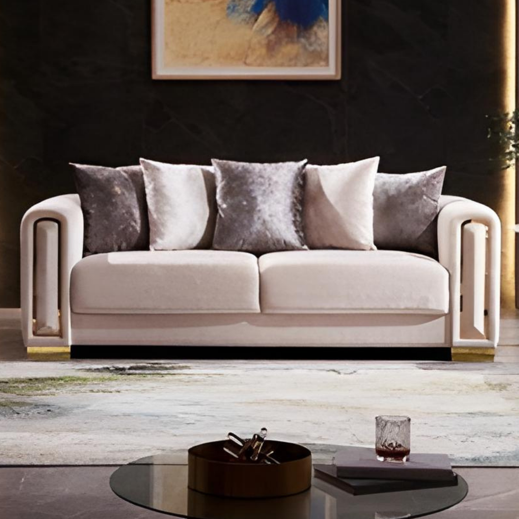 A refined beige luxury sofa set combining velvet-touch fabric, gold-accent detailing, and a contemporary architectural silhouette. Designed for clients seeking premium comfort, timeless style, and a centrepiece that elevates any living space.
