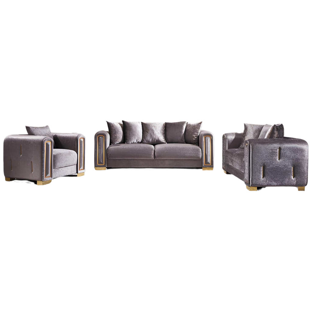 The Zeyus set brings a polished style to the living space with its elegant velvet fabric, structured seating, and gold-detailed arms. The sofa, loveseat, and chair each maintain clean lines and a balanced silhouette, offering comfort without sacrificing aesthetics.