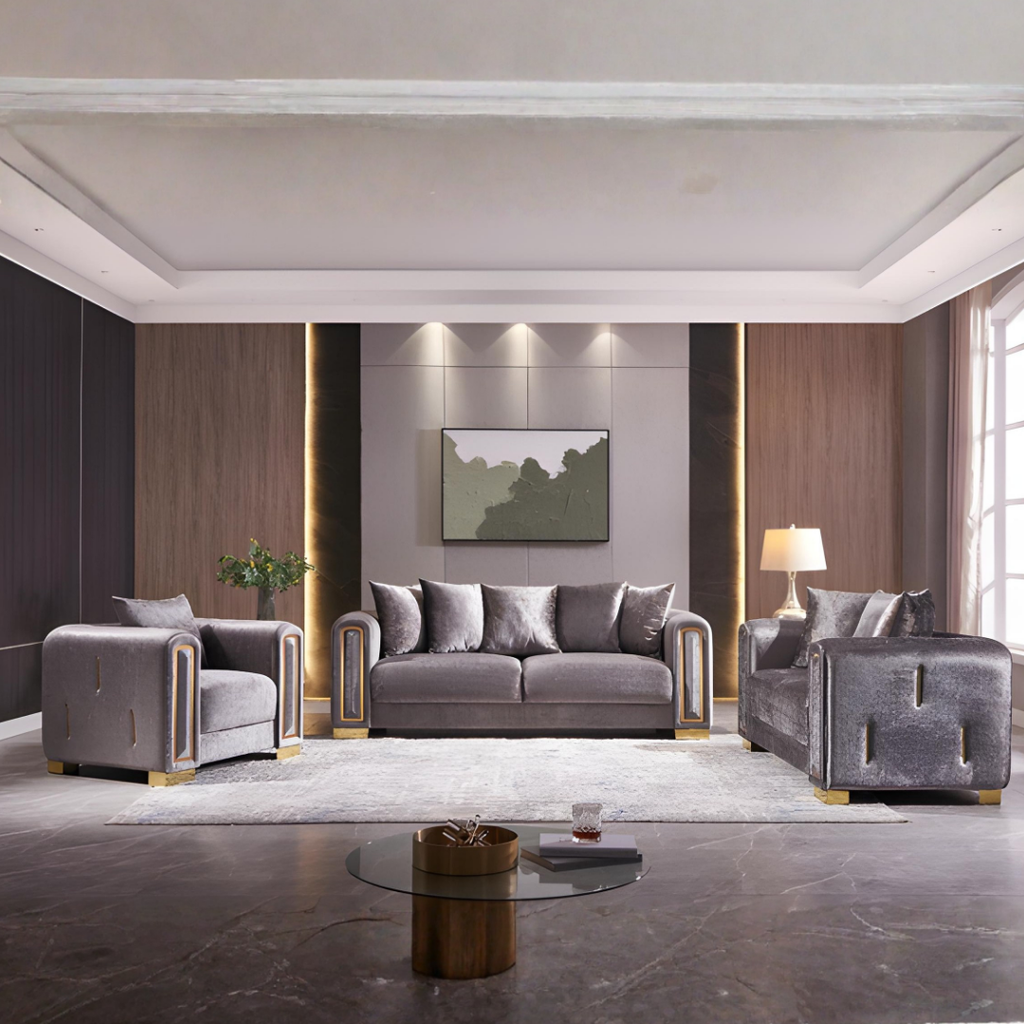 A refined 3-piece velvet sofa set designed for modern interiors. Zeyus combines a contemporary silhouette, plush seating, and gold-accent detailing to deliver a statement piece that elevates any living room. The set includes a sofa, loveseat, and chair—all crafted for long-lasting comfort and visual impact.
