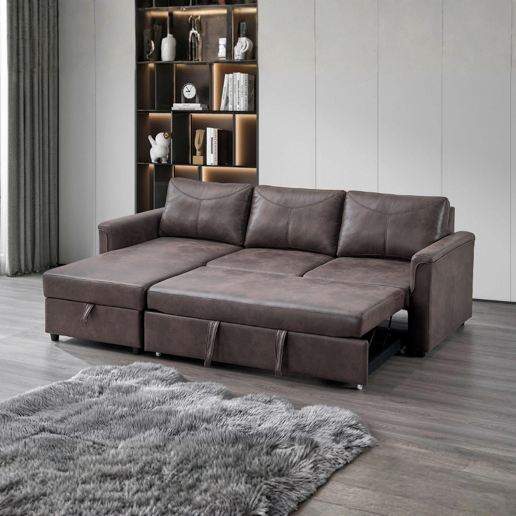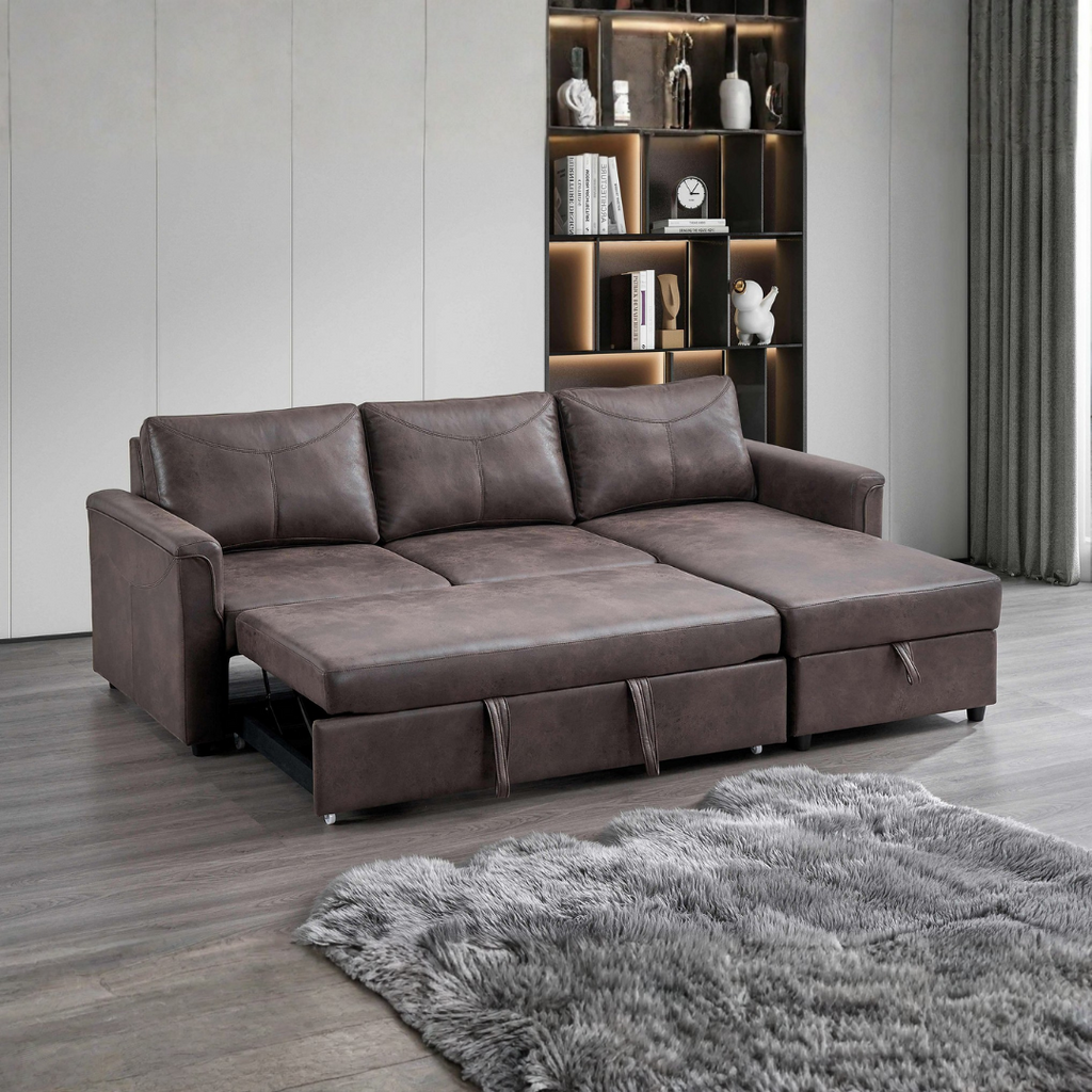 Zirema is built for multifunctional living, offering seating, storage, and sleeping in one compact design. The chaise (RHF or LHF depending on the variant you select below) lifts to reveal generous storage. The sofa converts into a sleeper using a smooth pull-out system, ideal for guests. A drop-down back panel with cup holders and built-in USB/USB-C charging makes daily use even more convenient. Wrapped in brown Faux Leather, Zirema combines comfort, practicality, and contemporary style.