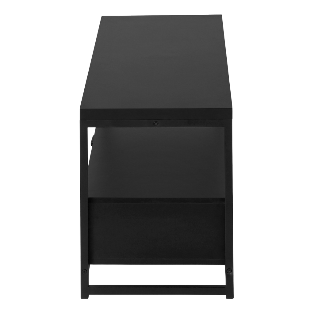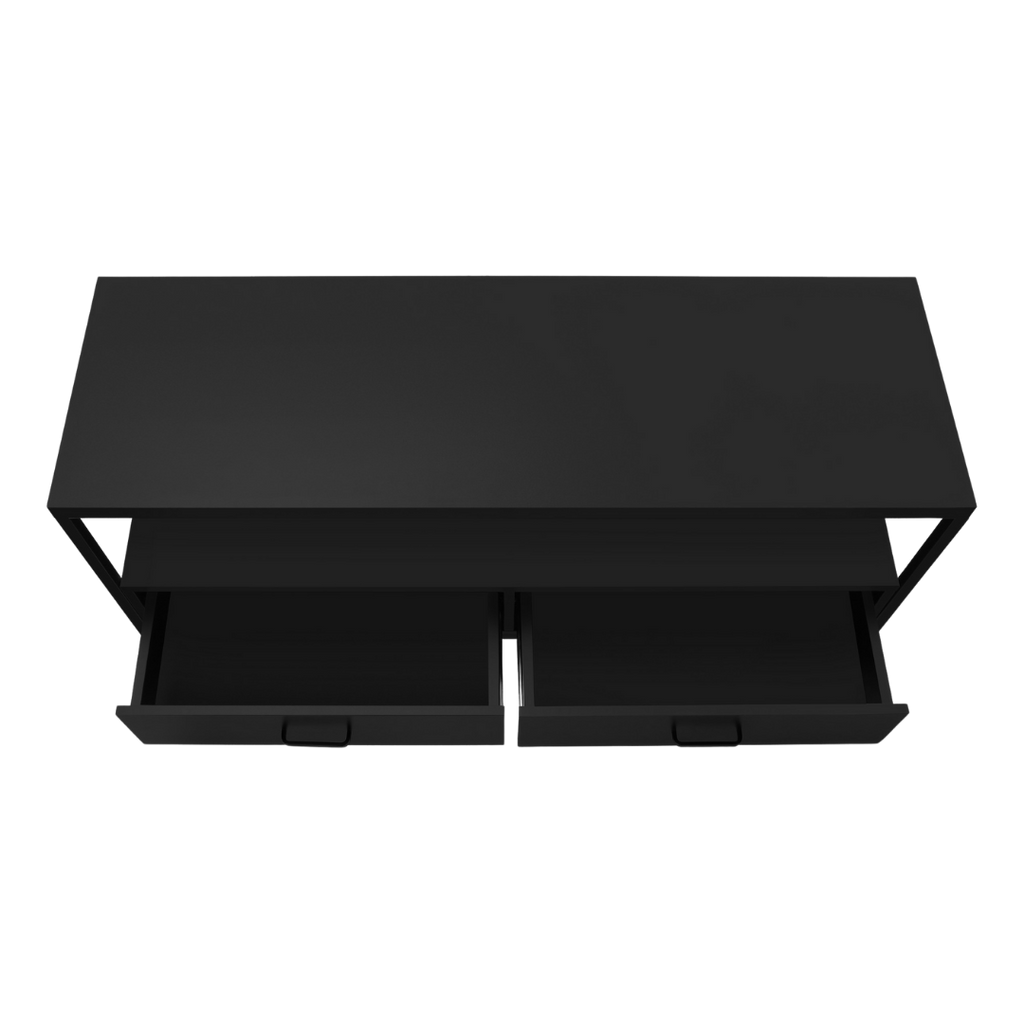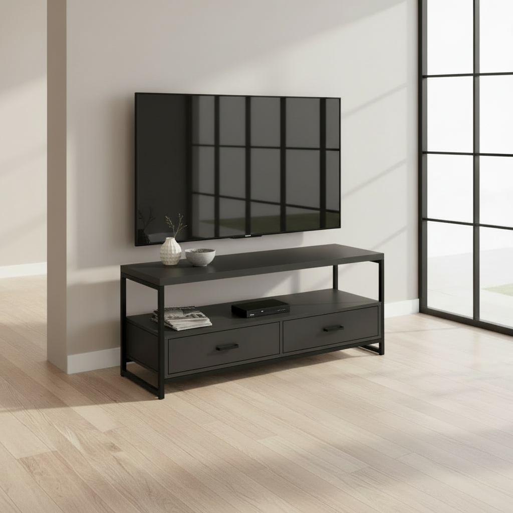 A sleek 48" TV stand in full black, combining modern minimalism with efficient storage. Zyven features open shelving, double drawers, and a sturdy black metal structure—perfect for contemporary living rooms and tight spaces.