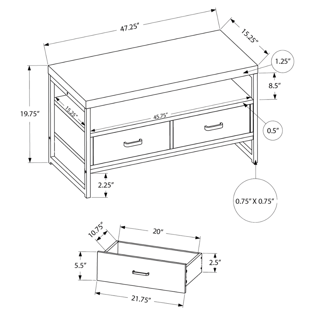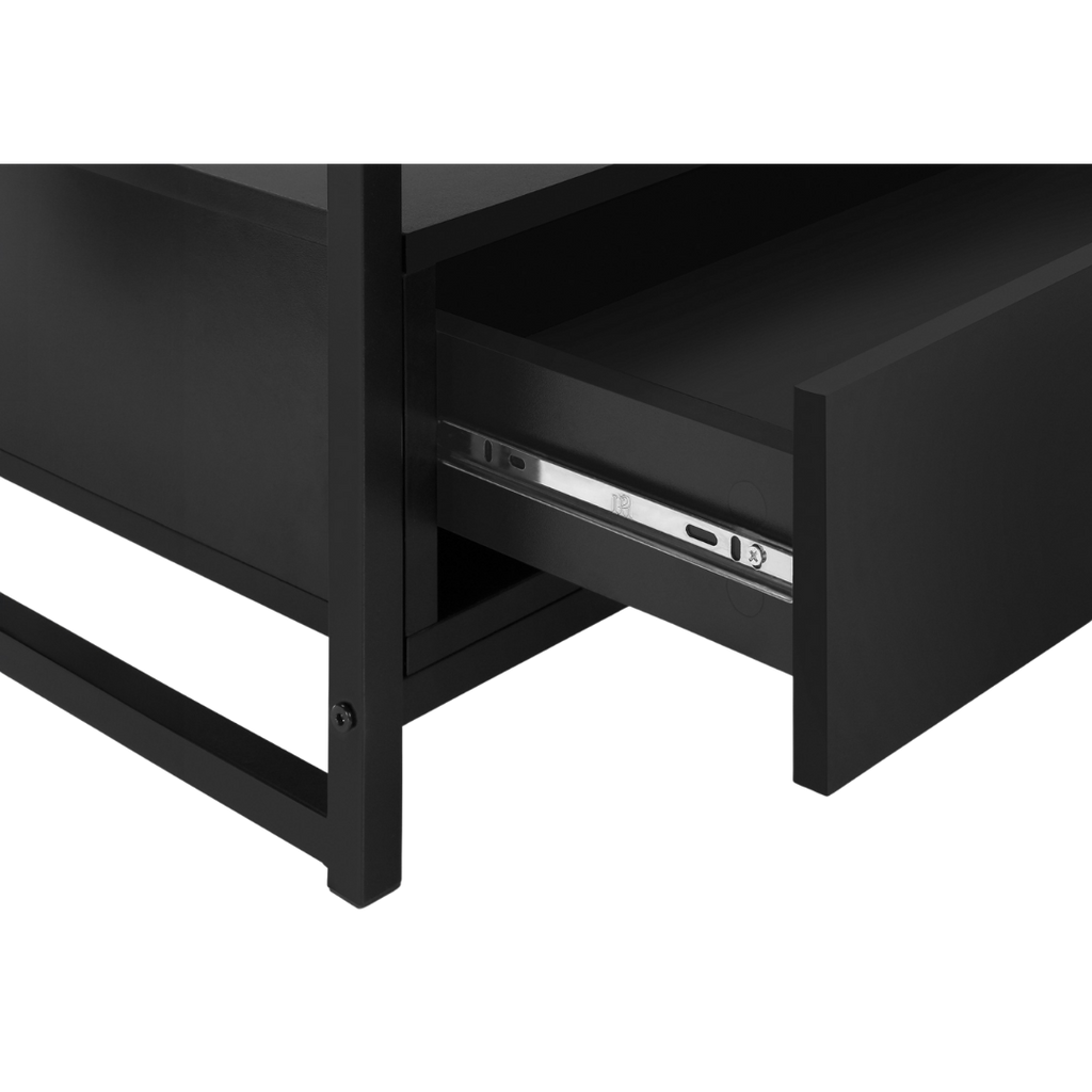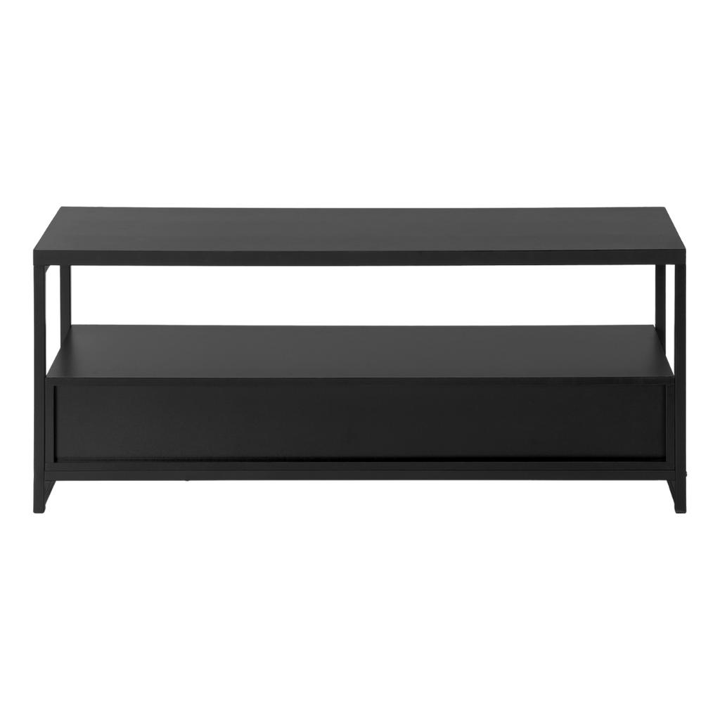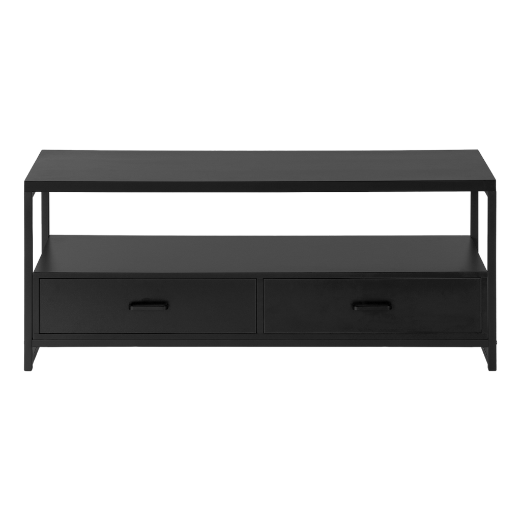 The all-black Zyven brings a clean, modern look to any living space. Its open middle shelf offers quick access to media components, while two seamlessly integrated drawers provide hidden storage. Built with a thick-panel top and a sturdy steel frame, it combines durability and elegance in a compact size ideal for condos or bedrooms. Assembly is simple with all included hardware.